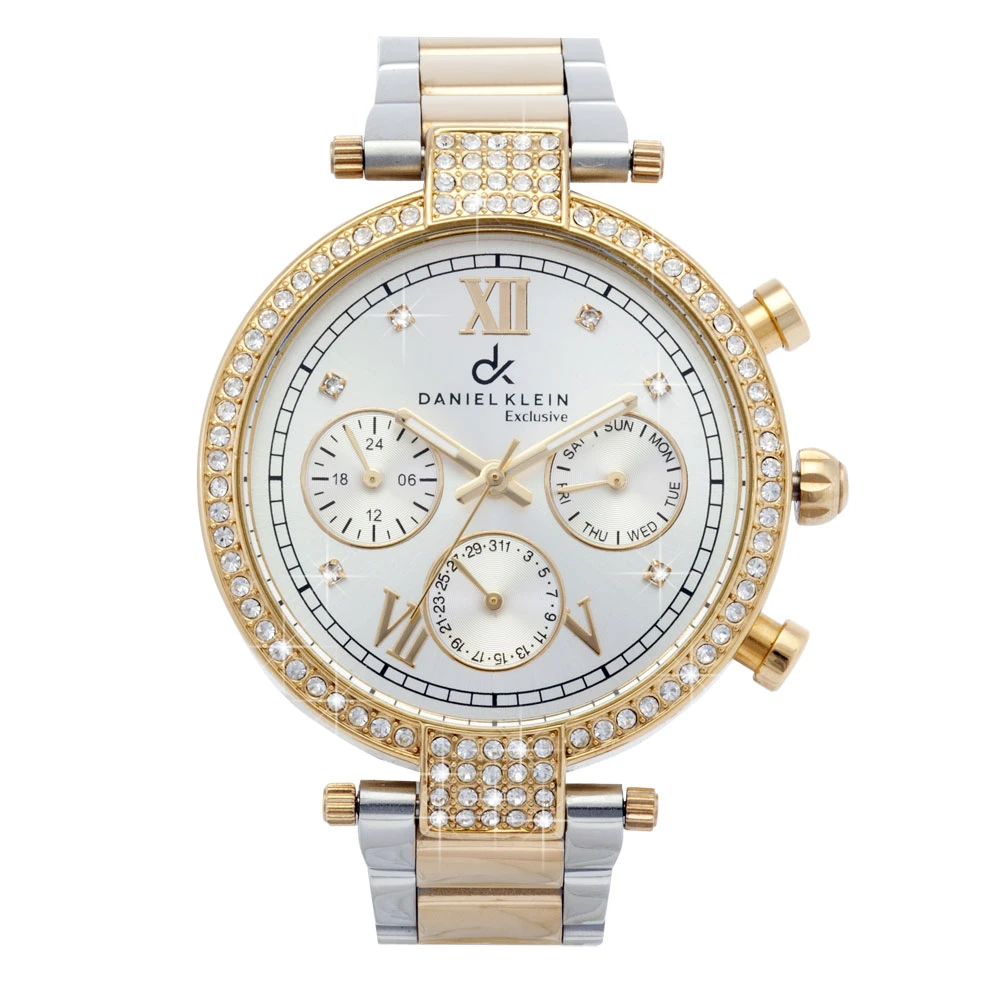 Hodinky dámské Daniel Klein, hodinky pro ženy, se kterými již nikdy nepřijdete pozdě. Pohon těchto hodinek zajišťuje spolehlivý bateriový strojek. Hodinky jsou vybavené hodinovou, minutovou a vteřinovou ručičkou. Dále tyto hodinky disponují ukazatelem celých hodin dne v týdnu a datumkou. Všechny náramkové hodinky Daniel Klein jsou dodávané v originální krabičce s logem Daniel Klein.