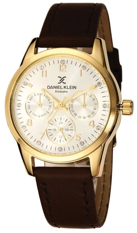 Dámské hodinky Daniel Klein. Kovové pouzdro hodinek má zlatou barvu, řemínek z kůže se zapínáním na jednoduchou sponu je hnědý. Hodinky jsou vybavené multifunkčním ukazatelem data, dne v týdnu a celých hodin. Hodinky dále disponují hodinovou, minutovou a vteřinovou ručkou. Provoz hodinek zajišťuje bateriový strojek. Průměr pouzdra 36mm, průměr ciferníku 30mm, kožený pásek je široký 18mm.