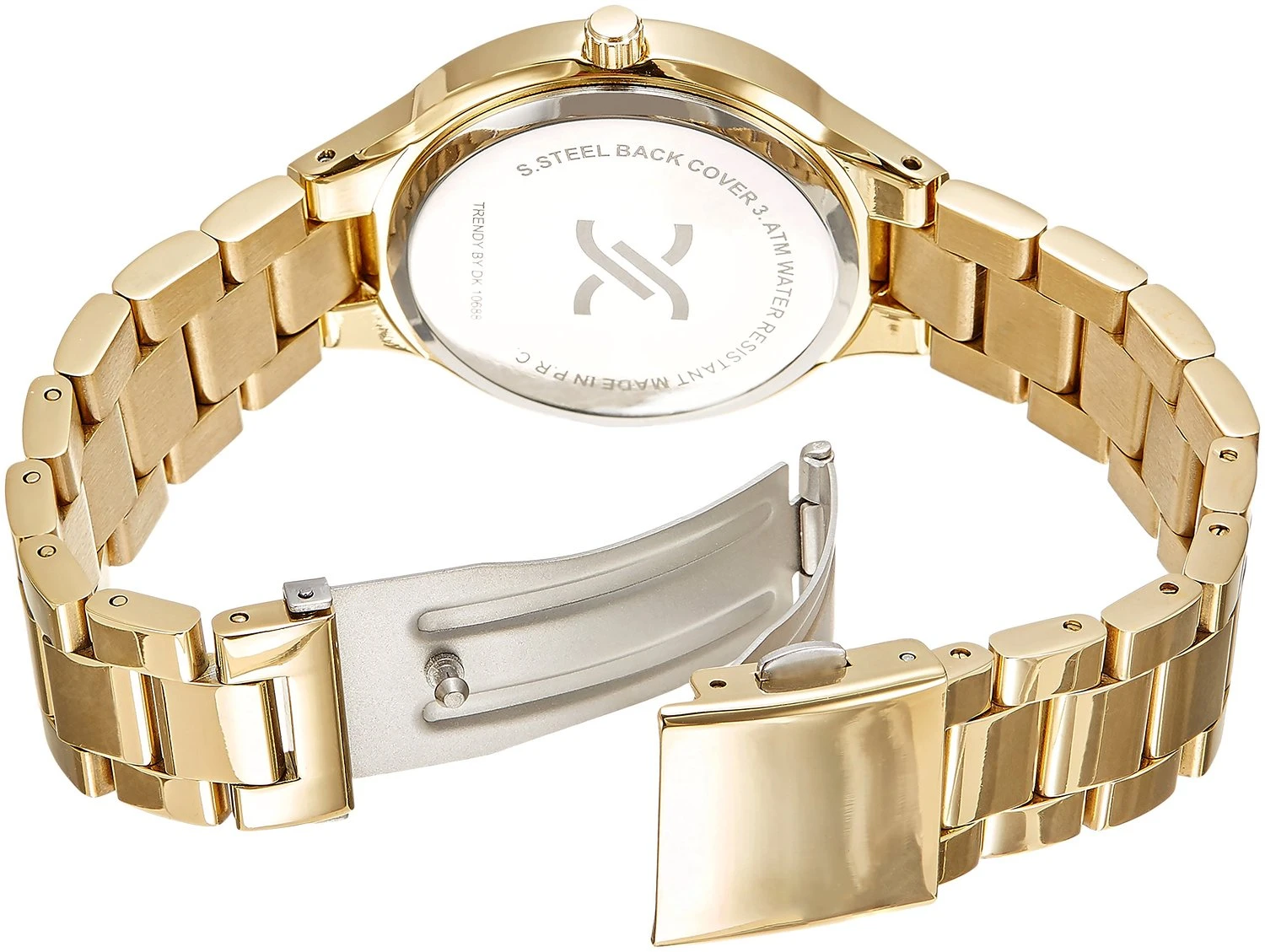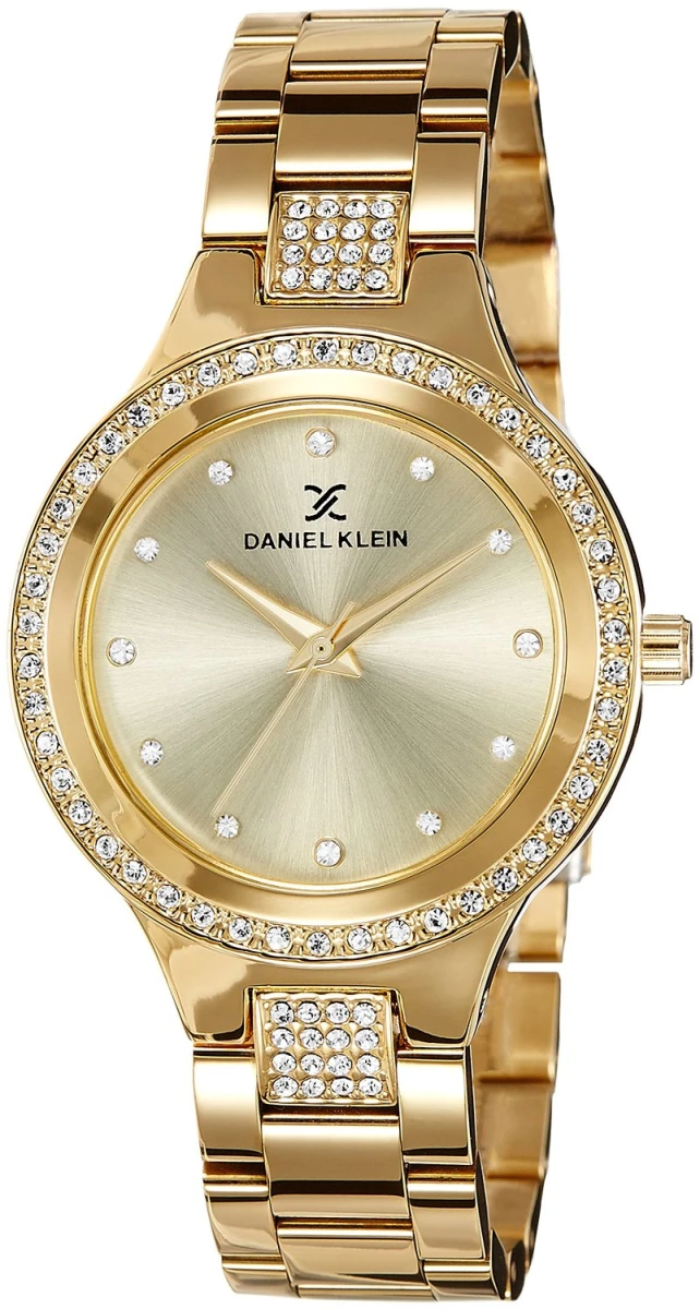 Dámské hodinky Daniel Klein. Kovové pouzdro hodinek a tah mají zlatou barvu. Hodinky disponují hodinovou, minutovou a vteřinovou ručkou. Provoz hodinek zajišťuje bateriový strojek. Průměr pouzdra 36mm, průměr ciferníku 26mm, kovový tah se zapínáním na skládací sponu s pojistnou pružinou je široký 16mm.