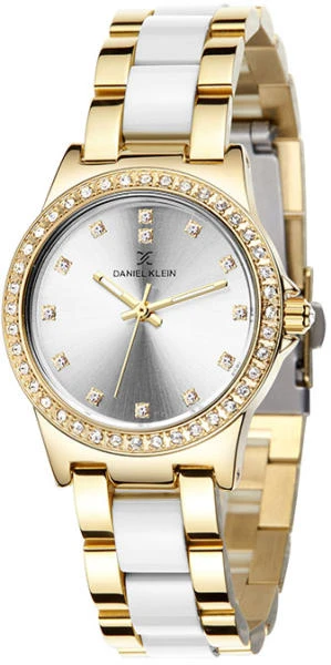 Dámské hodinky Daniel Klein. Kovové pouzdro hodinek má zlatou barvu. Tah je kombinace kovu a bílého plastu. Hodinky disponují hodinovou, minutovou a vteřinovou ručkou. Provoz hodinek zajišťuje bateriový strojek. Průměr pouzdra 32mm, průměr ciferníku 26mm, kovový tah se zapínáním na skládací sponu s pojistnou pružinou je široký 16mm.