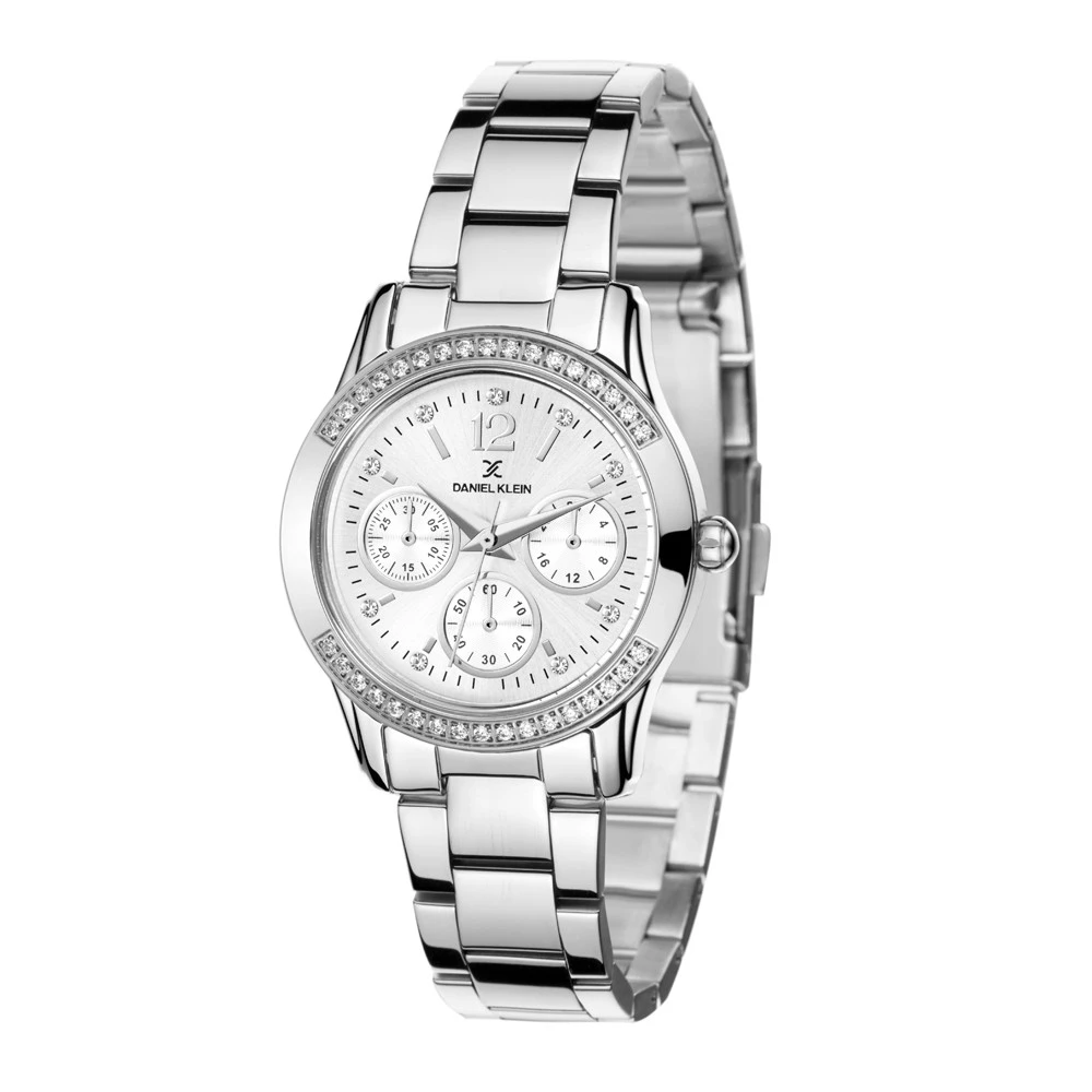 Dámské hodinky Daniel Klein. Kovové pouzdro hodinek a tah mají stříbrnou barvu. Hodinky disponují hodinovou, minutovou a vteřinovou ručkou. Chronograf není funkční a je pouze ozdobný. Provoz hodinek zajišťuje bateriový strojek. Průměr pouzdra 32mm, průměr ciferníku 26mm, kovový tah se zapínáním na skládací sponu s pojistnou pružinou je široký 14mm