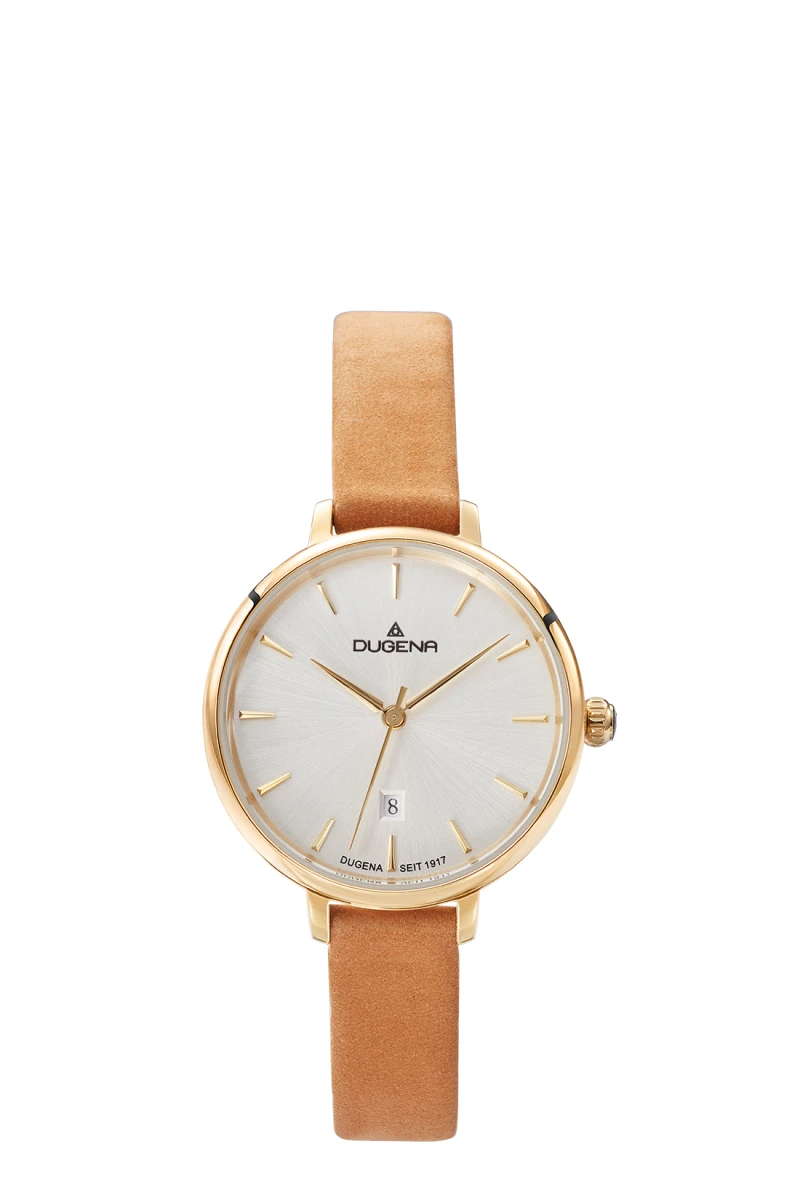 Dámské hodinky na ruku Dugena s koženým řemínkem. Hodinky jsou vyrobené z chirurgické oceli, sklíčko hodinek je minerální. Kulatý stříbrný ciferník se zlatými indexy. Hodinky jsou vybavené ukazatelem data, hodinovou, minutovou a vteřinovou ručkou. Pouzdro hodinek je pozlacené žlutým zlatem technologií IP. Průměr pouzdra hodinek 30 mm. Chod hodinek zajišťuje spolehlivý bateriový strojek. Hodinky jsou vodotěsné na úrovni 3 ATM. Na všechny dámské hodinky Dugena platí záruka v délce 36 měsíců. Hodinky jsou dodávané v dárkové krabičce s logem.