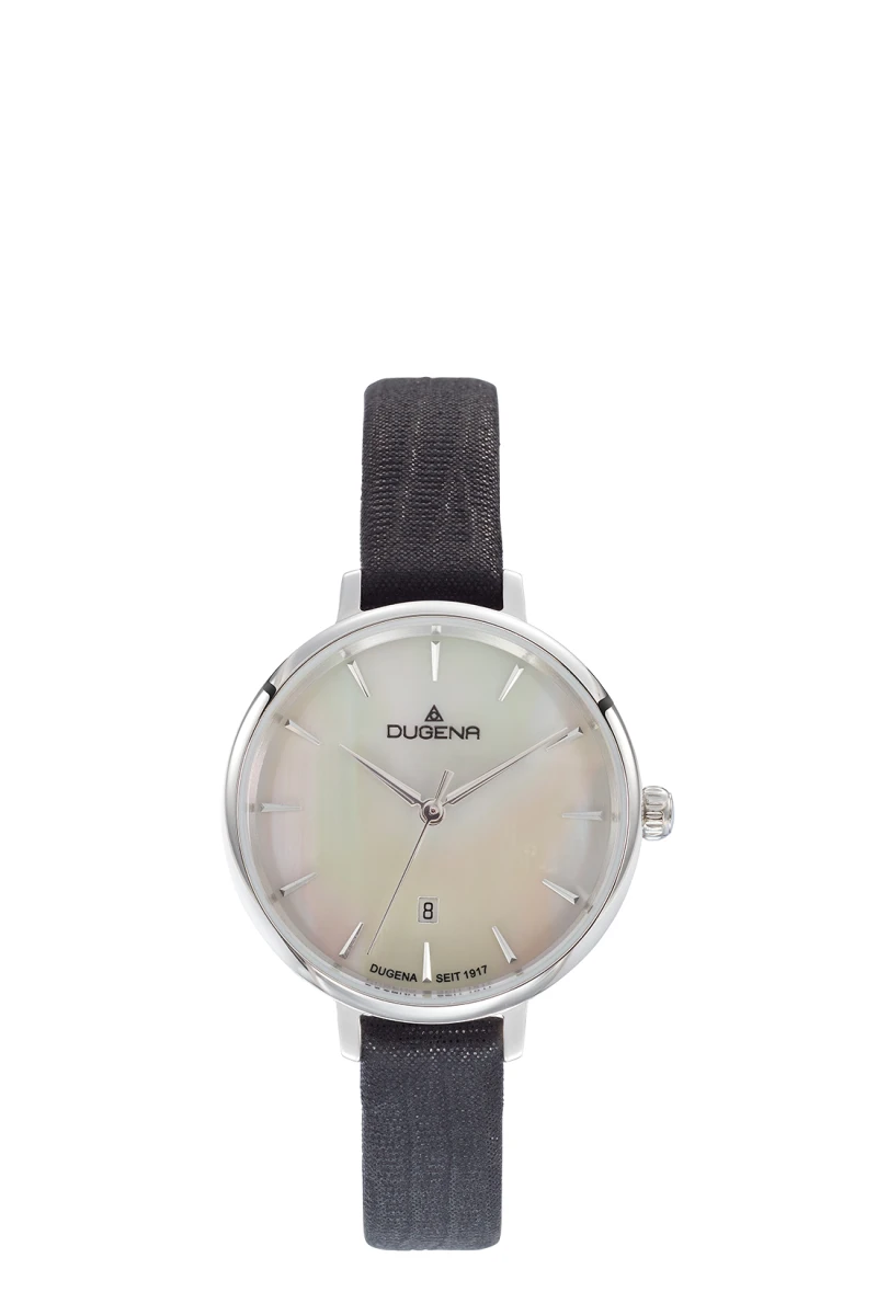 Dámské hodinky na ruku Dugena s koženým řemínkem. Hodinky jsou vyrobené z chirurgické oceli, sklíčko hodinek je minerální. Kulatý ciferník s perleťovým efektem a indexy. Hodinky jsou vybavené ukazatelem data, hodinovou, minutovou a vteřinovou ručkou. Průměr pouzdra hodinek 30 mm. Chod hodinek zajišťuje spolehlivý bateriový strojek. Hodinky jsou vodotěsné na úrovni 3 ATM. Na všechny dámské hodinky Dugena platí záruka v délce 36 měsíců. Hodinky jsou dodávané v dárkové krabičce s logem.