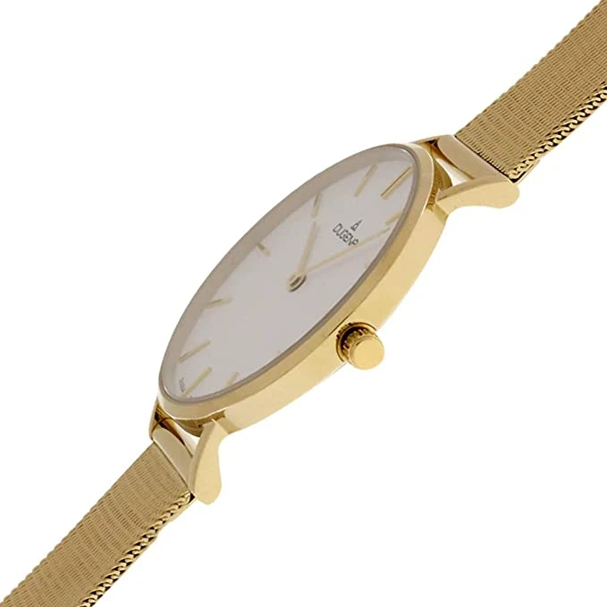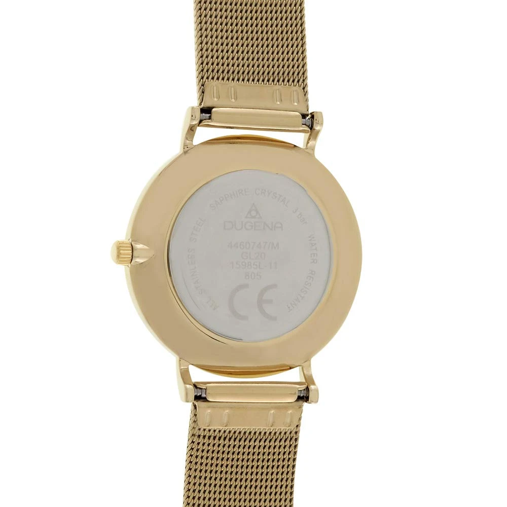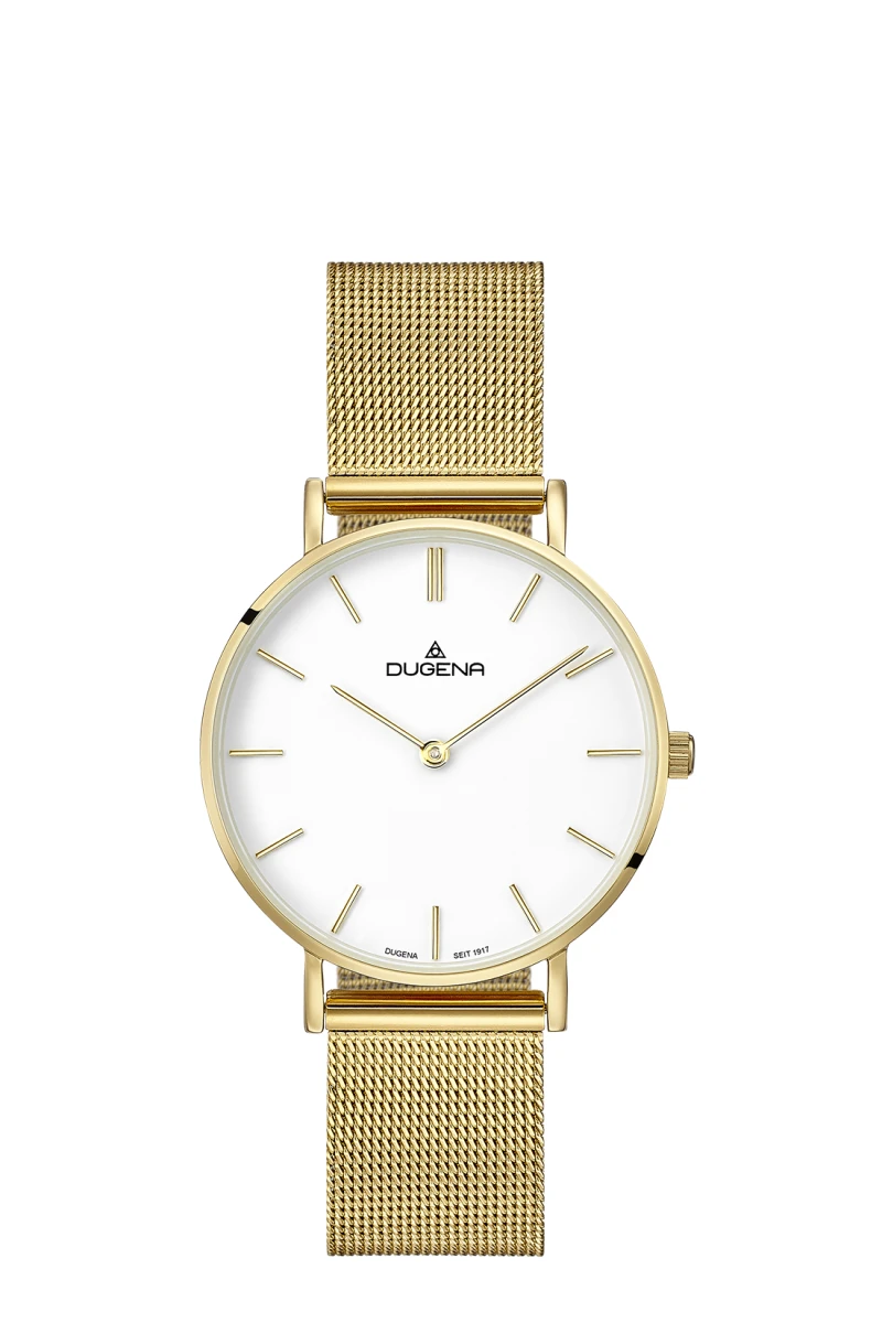 Dámské náramkové hodinky Dugena z chirurgické oceli, sklíčko hodinek je minerální. Kulatý bílý ciferník s indexy. Hodinky jsou vybavené hodinovou a minutovou ručkou. Rozměr pouzdra 33,5x7 mm. Chod hodinek zajišťuje spolehlivý bateriový strojek. Povrch hodinek je pozlacený žlutým zlatem technologií PVD. Hodinky jsou vodotěsné na úrovni 3 ATM. Na všechny dámské hodinky Dugena platí záruka v délce 36 měsíců. Hodinky jsou dodávané v dárkové krabičce s logem.