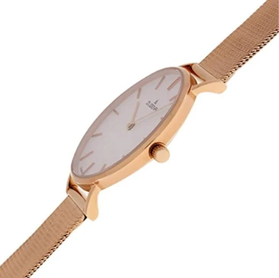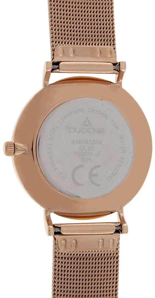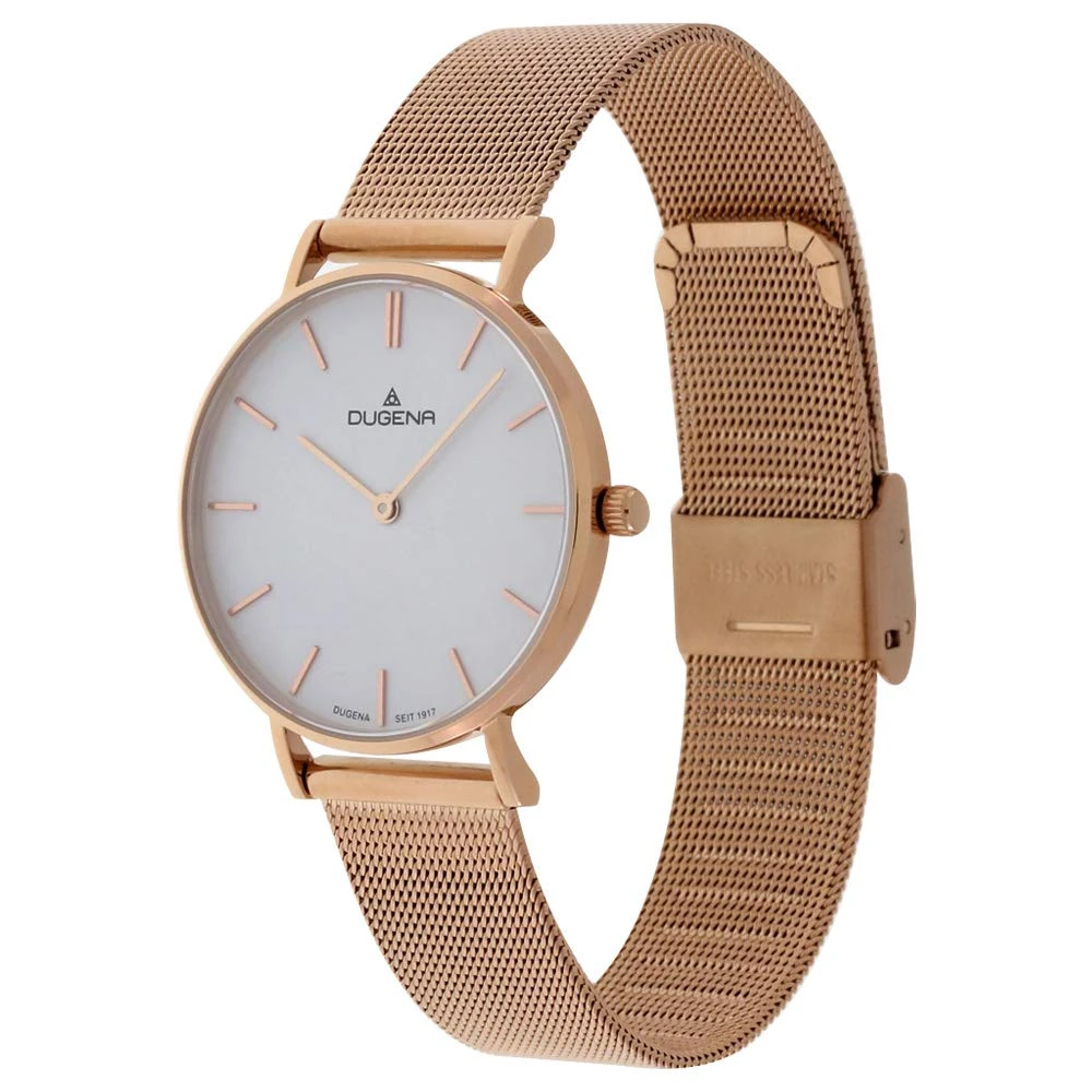 Hodinky dámské Dugena s ocelovým náramkem. Hodinky jsou vyrobené z chirurgické oceli, sklíčko hodinek je minerální. Kulatý bílý ciferník s indexy. Hodinky jsou vybavené hodinovou a minutovou ručkou. Rozměr pouzdra 33,5x7 mm. Chod hodinek zajišťuje spolehlivý bateriový strojek. Povrch hodinek je pozlacený růžovým zlatem technologií PVD. Hodinky jsou vodotěsné na úrovni 3 ATM. Na všechny dámské hodinky Dugena platí záruka v délce 36 měsíců. Hodinky jsou dodávané v dárkové krabičce s logem.