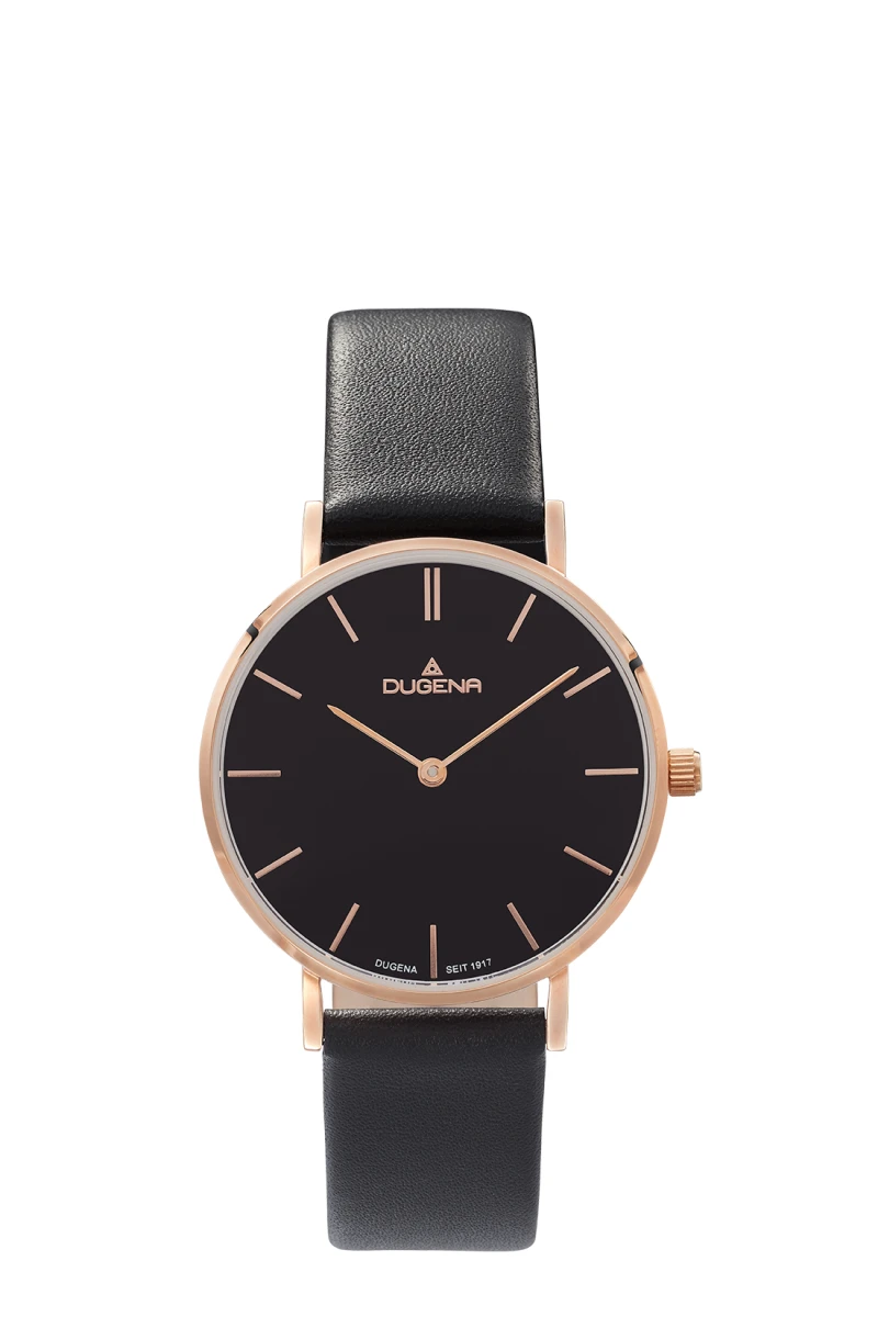 Moderní dámské hodinky Dugena s koženým řemínkem. Hodinky mají pouzdro vyrobené z chirurgické oceli, sklíčko hodinek je minerální. Kulatý černý ciferník s indexy. Hodinky jsou vybavené hodinovou a minutovou ručkou. Rozměr pouzdra 33,5x7 mm. Pouzdro hodinek má povrch pozlacený růžovým zlatem technologií PVD. Chod hodinek zajišťuje spolehlivý bateriový strojek. Hodinky jsou vodotěsné na úrovni 3 ATM. Na všechny dámské hodinky Dugena platí záruka v délce 36 měsíců. Hodinky jsou dodávané v dárkové krabičce s logem.