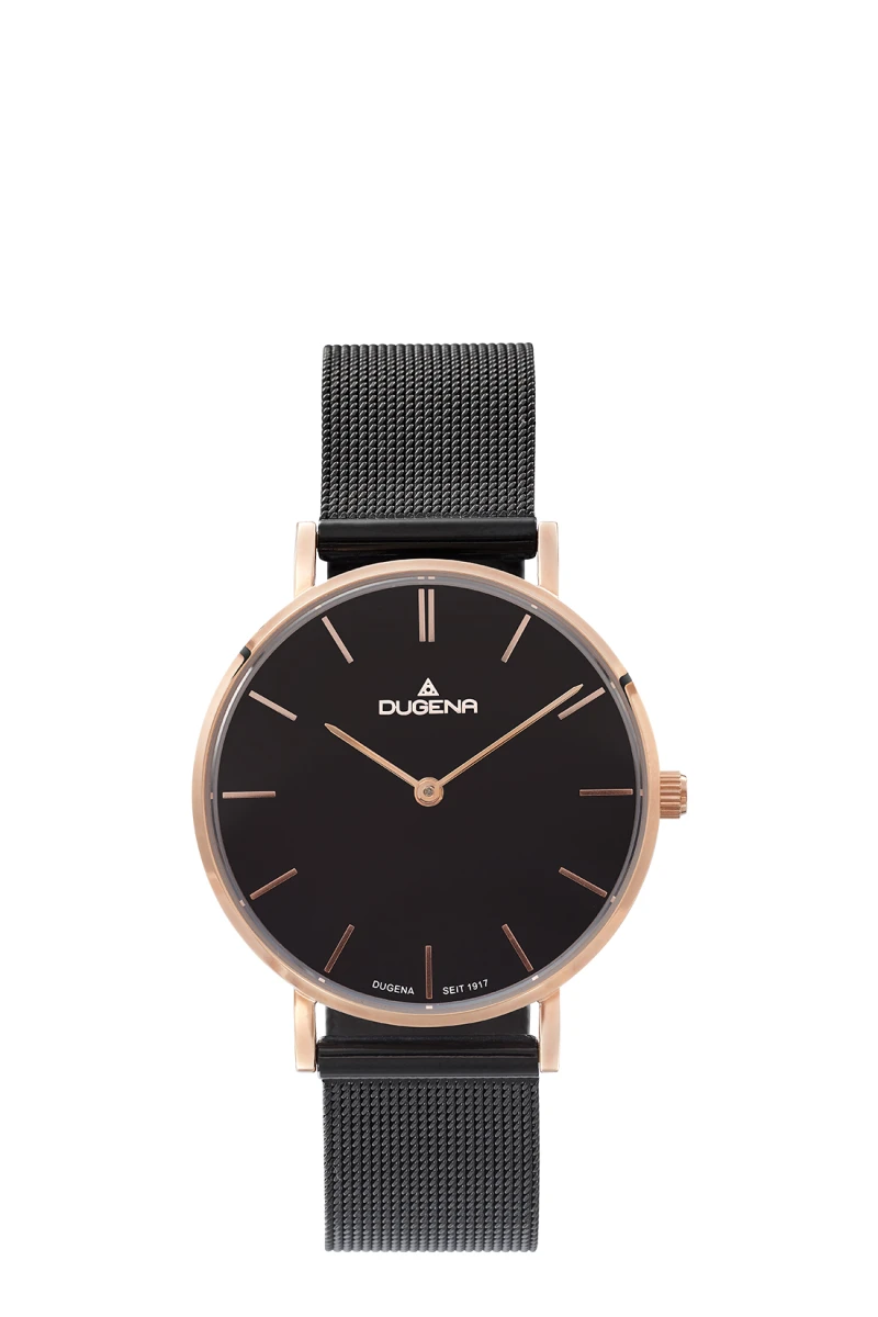 Hodinky dámské Dugena s černým náramkem vyrobené z chirurgické oceli, sklíčko hodinek je minerální. Kulatý černý ciferník s indexy. Hodinky jsou vybavené hodinovou a minutovou ručkou. Rozměr pouzdra 33,5x7 mm. Chod hodinek zajišťuje spolehlivý bateriový strojek. Povrch pouzdra hodinek je pozlacený růžovým zlatem technologií PVD. Hodinky jsou vodotěsné na úrovni 3 ATM. Na všechny dámské hodinky Dugena platí záruka v délce 36 měsíců. Hodinky jsou dodávané v dárkové krabičce s logem.