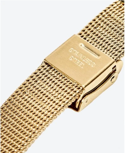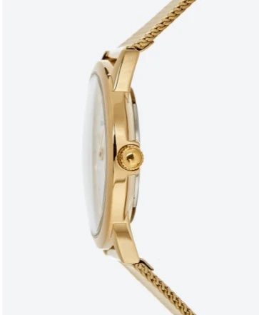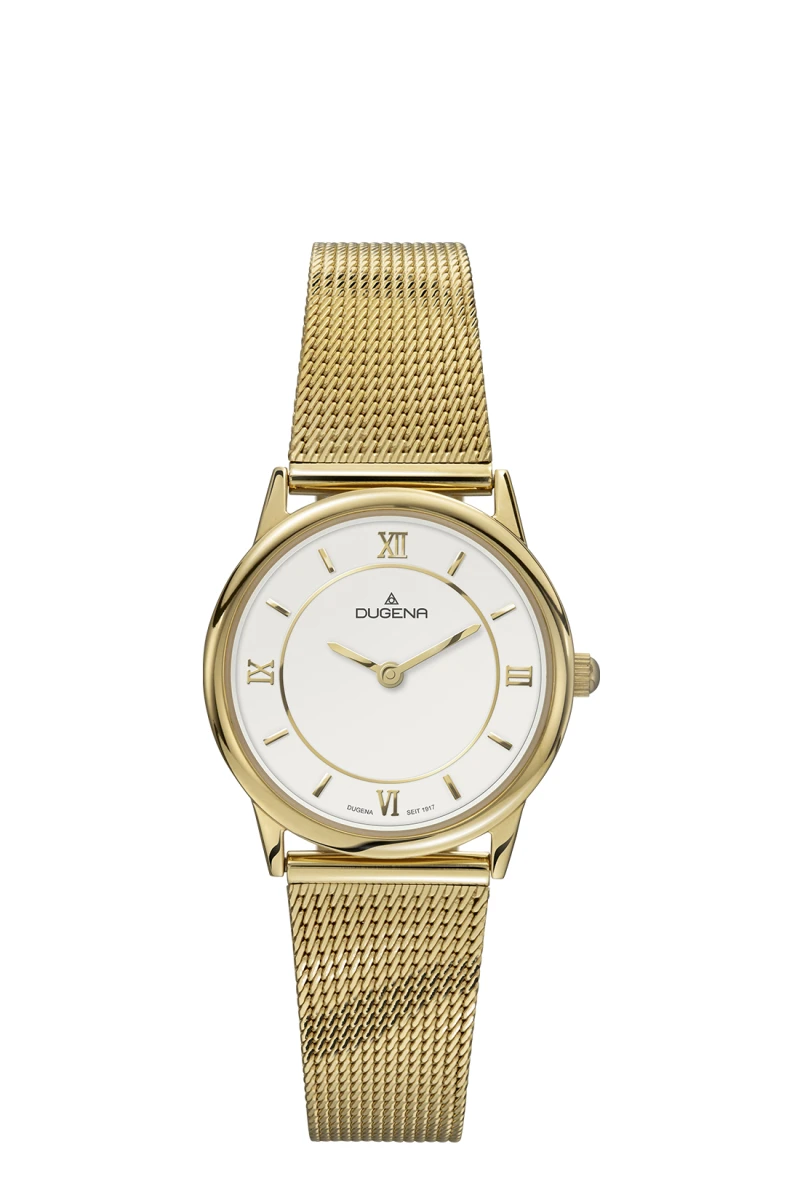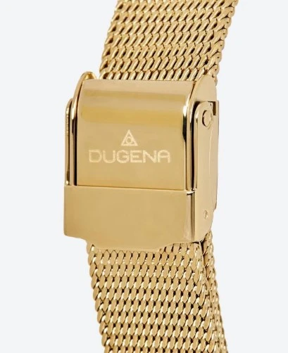 Dámské náramkové hodinky Dugena z chirurgické oceli s milánským tahem se zapínáním na posuvnou přezku, sklíčko hodinek je minerální. Kulatý bílý ciferník s římskými čísly a indexy. Hodinky jsou vybavené hodinovou a minutovou ručkou. Velikost pouzdra 29x7,5 mm. Povrch hodinky je upravený žlutým zlatem technologií PVD. Chod hodinek zajišťuje spolehlivý bateriový strojek. Hodinky jsou vodotěsné na úrovni 3 ATM. Na všechny dámské hodinky Dugena platí záruka v délce 36 měsíců. Hodinky jsou dodávané v dárkové krabičce s logem.