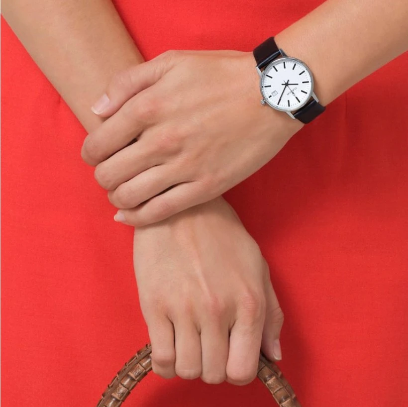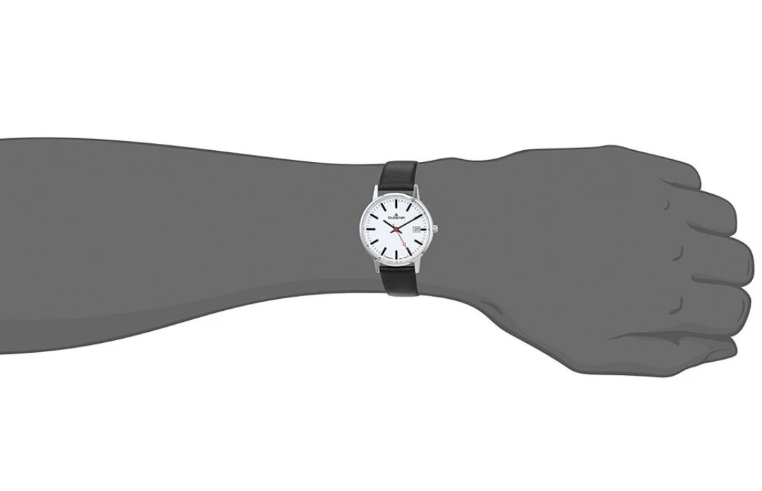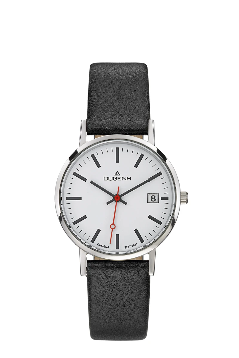 Dámské náramkové hodinky Dugena z chirurgické oceli s koženým řemínkem se zapínáním na jednoduchou přezku, sklíčko hodinek je minerální. Hodinky mají přehledný kulatý bílý ciferník s indexy. Hodinky jsou vybavené ukazatelem data, hodinovou, minutovou a vteřinovou ručkou. Velikost pouzdra 33x8 mm. Chod hodinek zajišťuje spolehlivý bateriový strojek. Hodinky jsou vodotěsné na úrovni 3 ATM. Na všechny dámské hodinky Dugena platí záruka v délce 36 měsíců. Hodinky jsou dodávané v dárkové krabičce s logem.