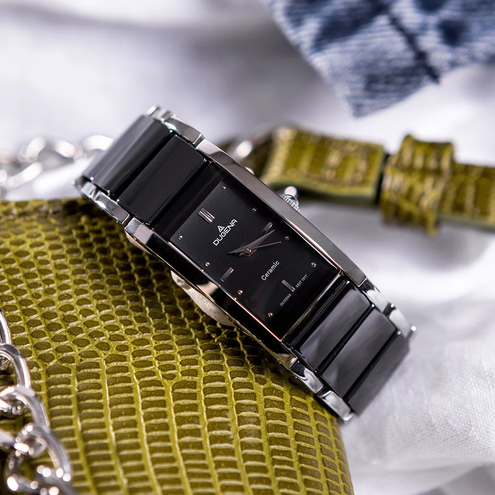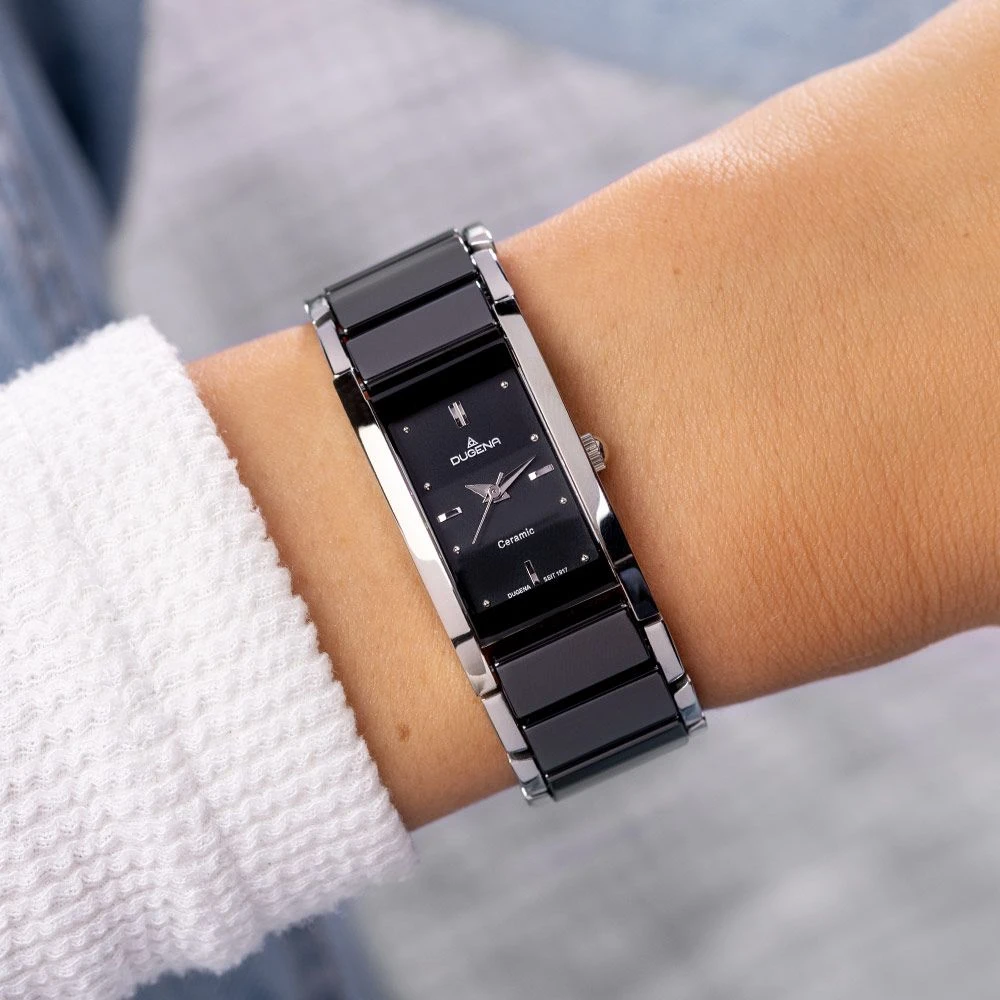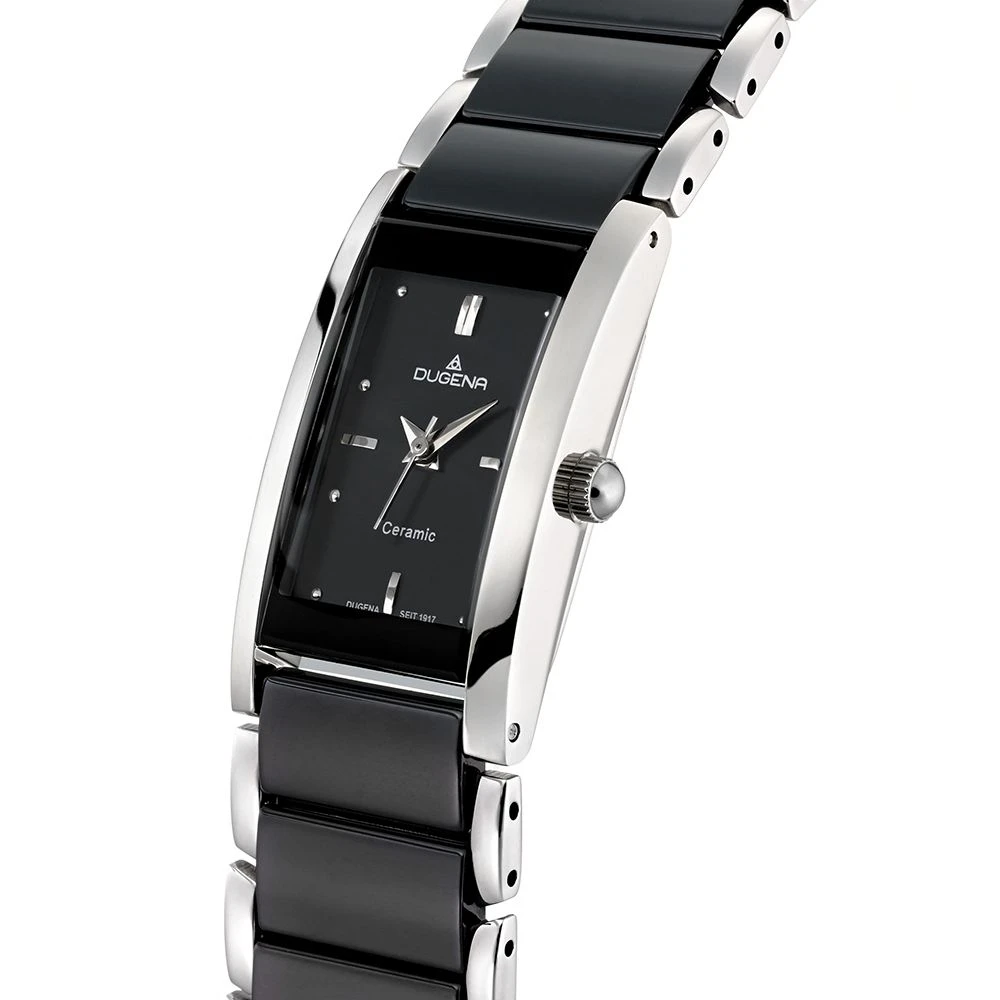 Dámské hodinky od Německého výrobce Dugena. Hodinky jsou kombinace ušlechtilé oceli a keramiky. Hodinky jsou vybavené hodinovou, minutovou a vteřinovou ručkou. Černý ciferník s indexy. Pouzdro hodinek má rozměr 20x35mm, výška pouzdra 9mm. Provoz hodinek zajišťuje spolehlivý bateriový strojek. Hodinky jsou dodávané v originální krabičce s logem Dugena. Tyto dámské hodinky jsou voděodolné na úrovni 3 ATM.