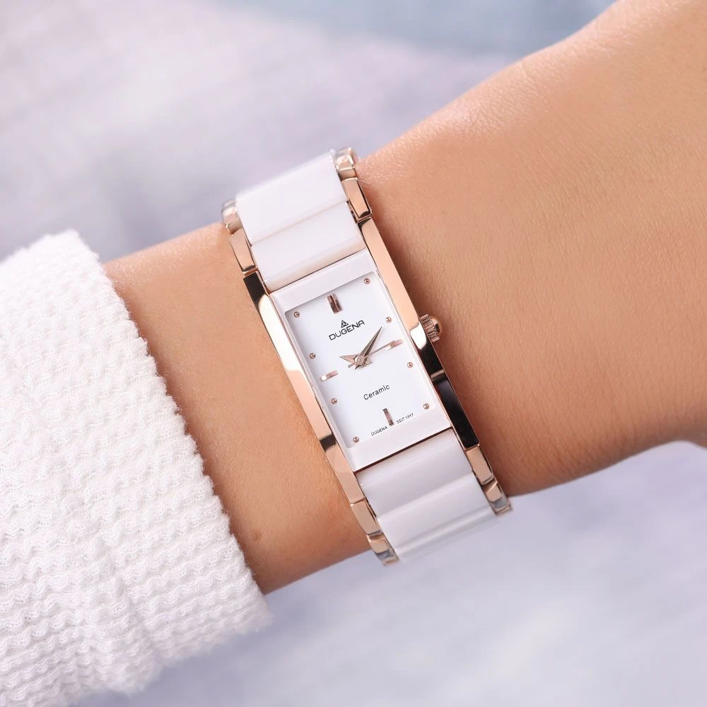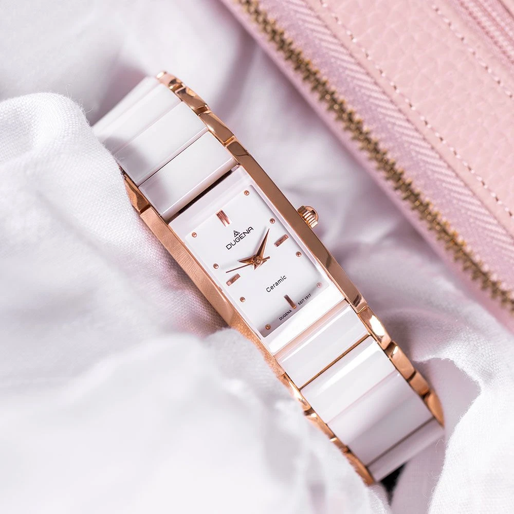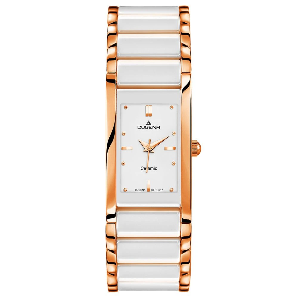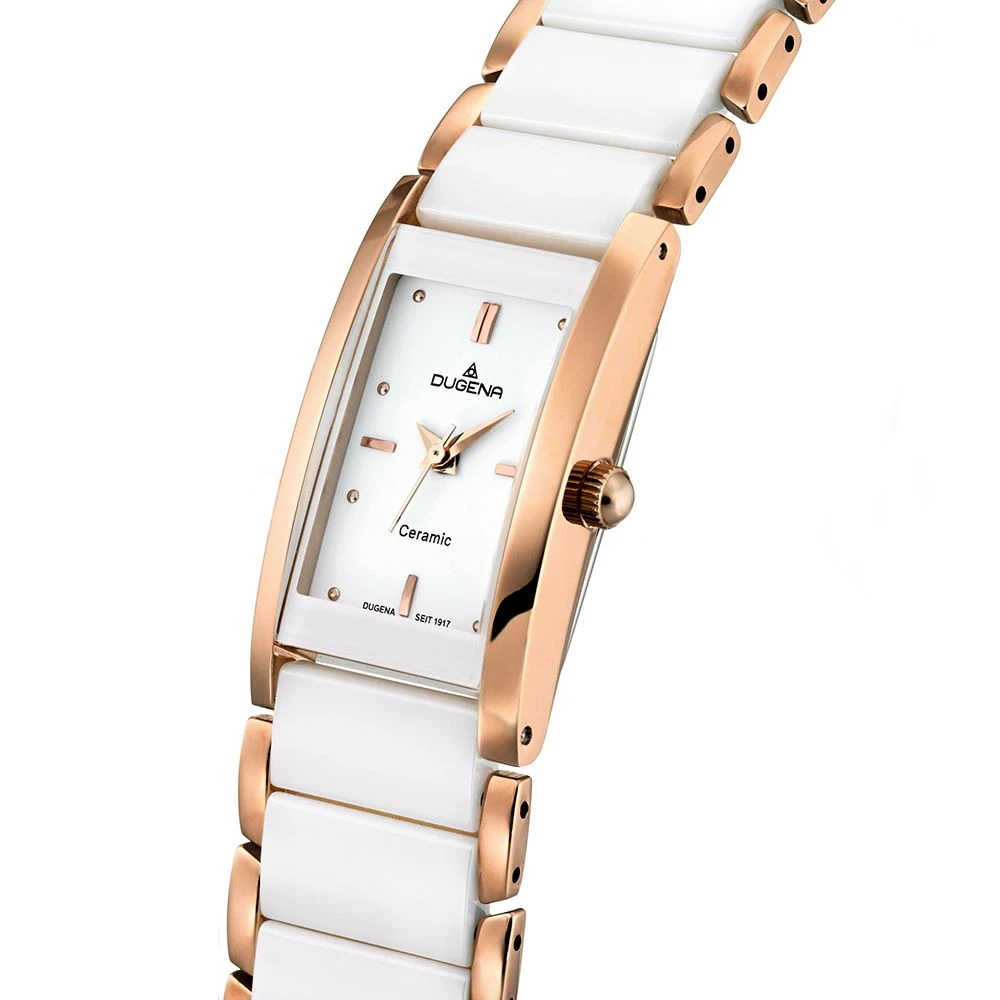 Dámské hodinky od Německého výrobce Dugena. Hodinky jsou kombinace ušlechtilé oceli a keramiky. Hodinky jsou vybavené hodinovou, minutovou a vteřinovou ručkou. Bílý ciferník s indexy. Pouzdro hodinek má rozměr 20x35mm, výška pouzdra 9mm. Povrch ocelových částí pouzdra a náramku je pozlacený růžovým zlatem technologií PVD. Provoz hodinek zajišťuje spolehlivý bateriový strojek. Hodinky jsou dodávané v originální krabičce s logem Dugena. Tyto dámské hodinky jsou voděodolné na úrovni 3 ATM.