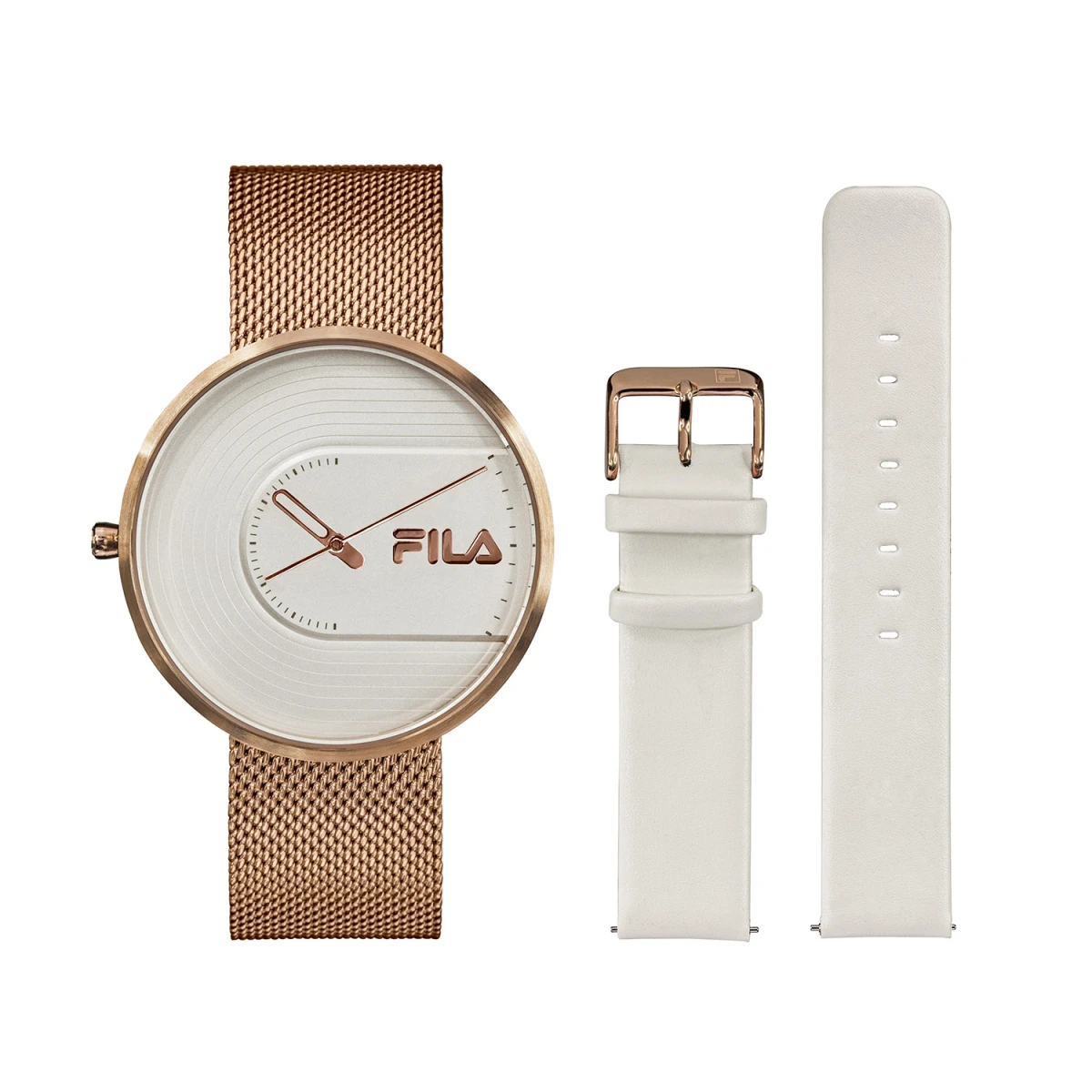 Náramkové hodinky Fila z chirurgické oceli v setu s koženým řemínkem. Pouzdro z chirurgické oceli s průměrem 40 mm, výška pouzdra 10 mm. Hodinky jsou vybavené hodinovou a minutovou ručkou. Provoz hodinek zajišťuje bateriový strojek Miyota 2025. Ocelový tah je široký 20 mm. K hodinkám náleží bílý kožený řemínek na výměnu. Hodinky jsou zabalené do společně s výměnným řemínkem do elegantní dárkové krabičky.