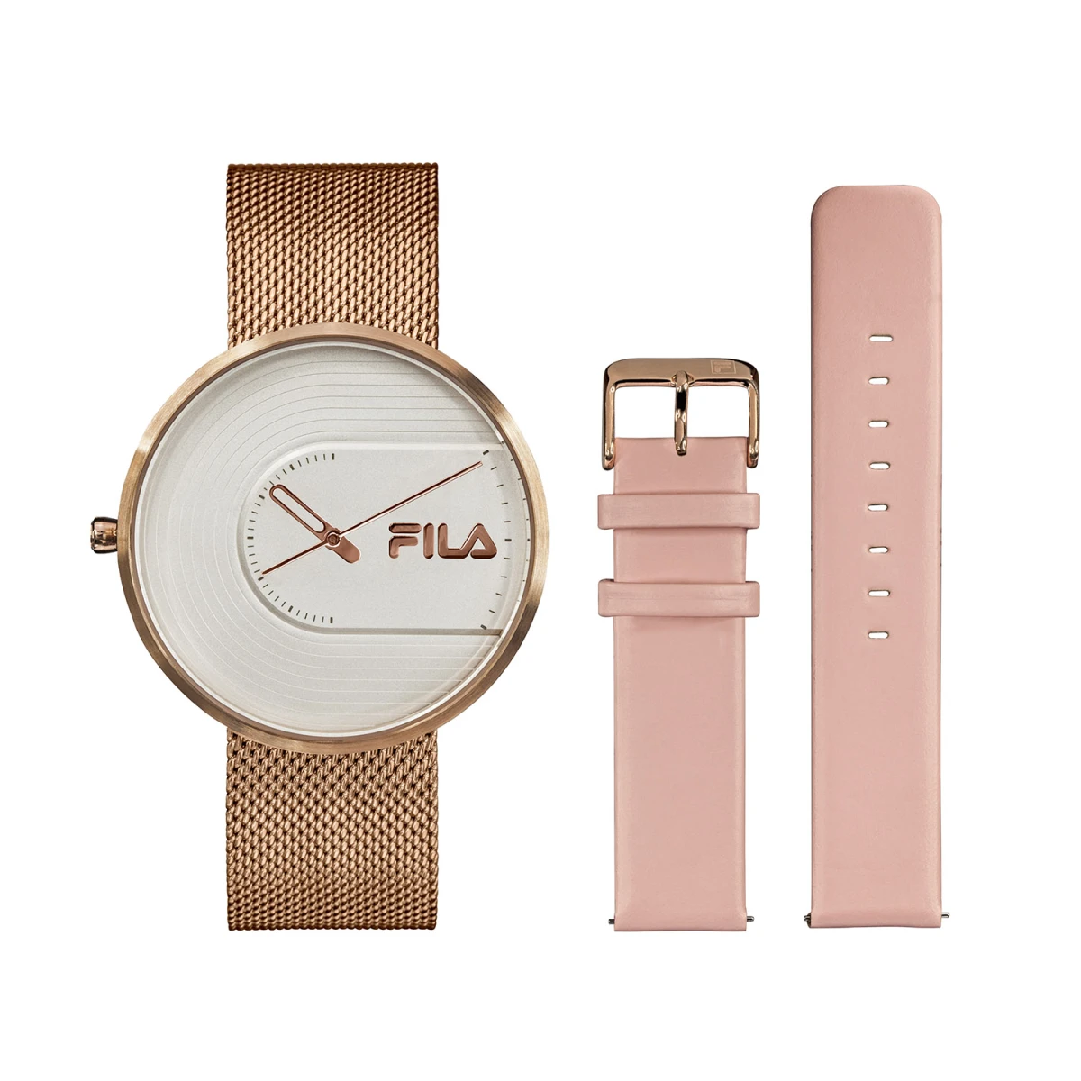 Náramkové hodinky Fila z chirurgické oceli v setu s koženým řemínkem. Pouzdro z chirurgické oceli s průměrem 40 mm, výška pouzdra 10 mm. Hodinky jsou vybavené hodinovou a minutovou ručkou. Provoz hodinek zajišťuje bateriový strojek Miyota 2025. Ocelový tah je široký 20 mm. K hodinkám náleží růžový kožený řemínek na výměnu. Hodinky jsou zabalené do společně s výměnným řemínkem do elegantní dárkové krabičky.