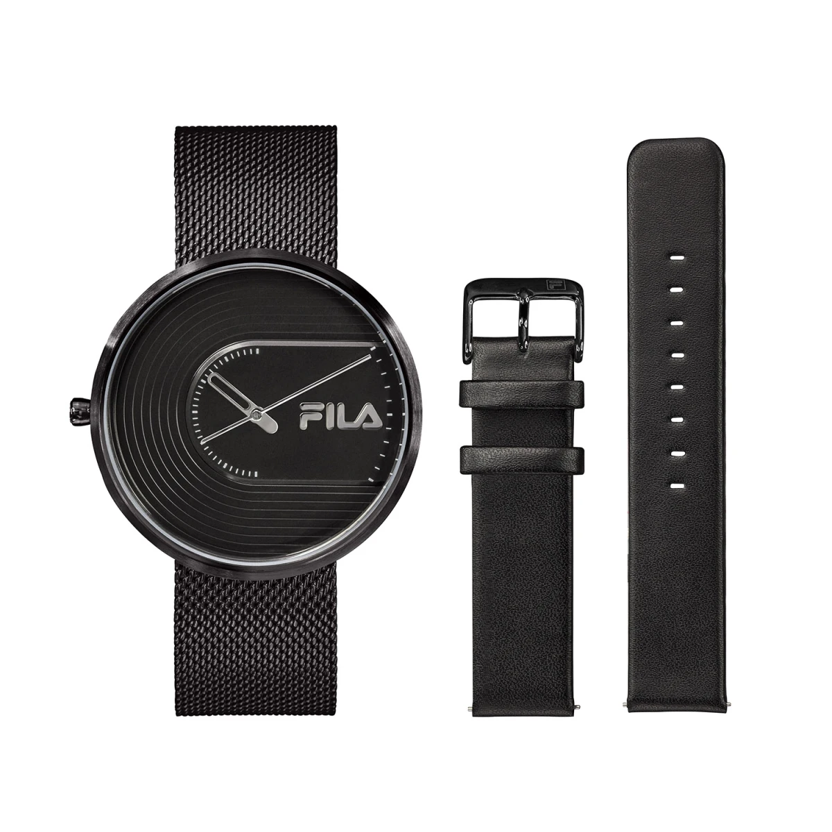 Náramkové hodinky Fila z chirurgické oceli v setu s koženým řemínkem. Pouzdro z chirurgické oceli s průměrem 40 mm, výška pouzdra 10 mm. Hodinky jsou vybavené hodinovou a minutovou ručkou. Provoz hodinek zajišťuje bateriový strojek Miyota 2025. Ocelový tah je široký 20 mm. K hodinkám náleží černý kožený řemínek na výměnu. Hodinky jsou zabalené do společně s výměnným řemínkem do elegantní dárkové krabičky.