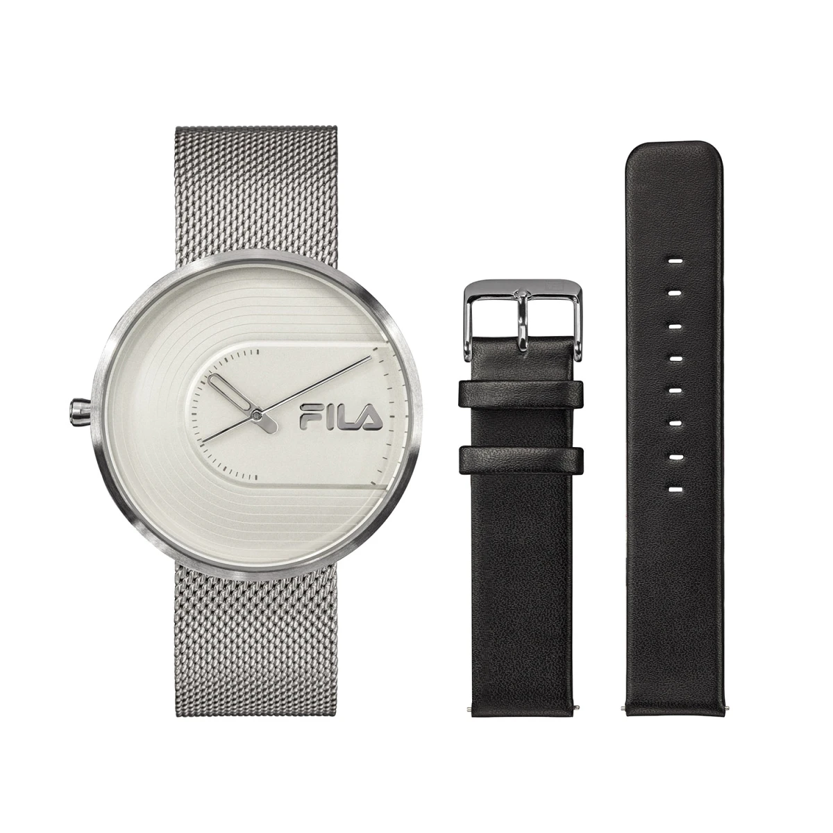 Náramkové hodinky Fila z chirurgické oceli v setu s koženým řemínkem. Pouzdro z chirurgické oceli s průměrem 40 mm, výška pouzdra 10 mm. Hodinky jsou vybavené hodinovou a minutovou ručkou. Provoz hodinek zajišťuje bateriový strojek Miyota 2025. Ocelový tah je široký 20 mm. K hodinkám náleží černý kožený řemínek na výměnu. Hodinky jsou zabalené do společně s výměnným řemínkem do elegantní dárkové krabičky.