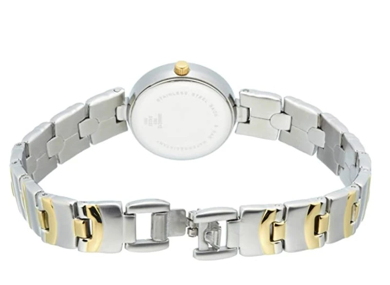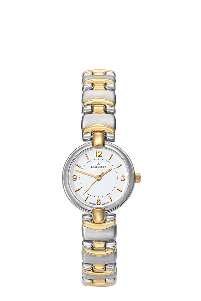 Dámské hodinky Dugena z chirurgické oceli. Sklíčko hodinek je minerální. Přehledný kulatý bílý ciferník s arabskými čísly a indexy. Hodinky jsou vybavené, hodinovou, minutovou a vteřinovou ručkou. Pouzdro hodinek má průměr 22,7 m, tloušťka pouzdra 6,5 mm. Zlaté prvky hodinek jsou pozlacené žlutým zlatem technologií IP. Chod hodinek zajišťuje spolehlivý bateriový strojek. Hodinky jsou vodotěsné na úrovni 3 ATM. Na všechny dámské hodinky Dugena je poskytovaná záruka v délce 36 měsíců. Hodinky jsou dodávané v dárkové krabičce s logem.