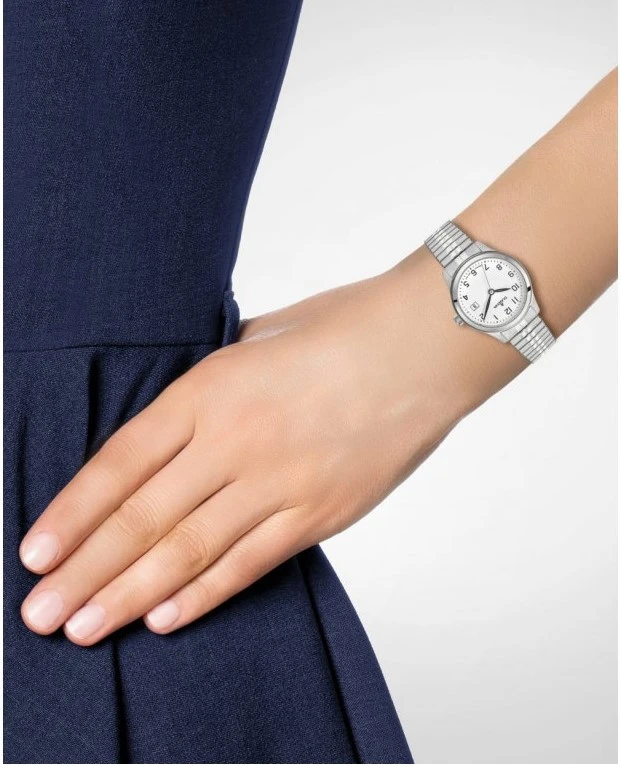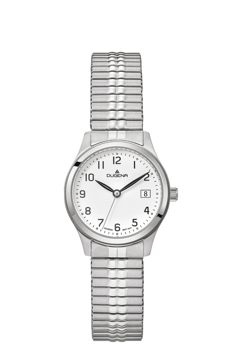 Dámské hodinky z chirurgické oceli s pružným náramkem. Díky pružnému náramku a přehlednému bílému ciferníku s černým číselníkem se jedná o velmi oblíbený typ dámských náramkových hodinek. Hodinky jsou vybavené datumkou, hodinovou, minutovou a vteřinovou ručkou. Hodinky mají odolné minerální sklíčko a jsou voděodolné na úrovni 5 ATM. Průměr pouzdra 28 mm. Chod těchto dámských hodinek zajišťuje spolehlivý bateriový strojek. Všechny dámské hodinky Dugena jsou dodávané v originální krabičce.