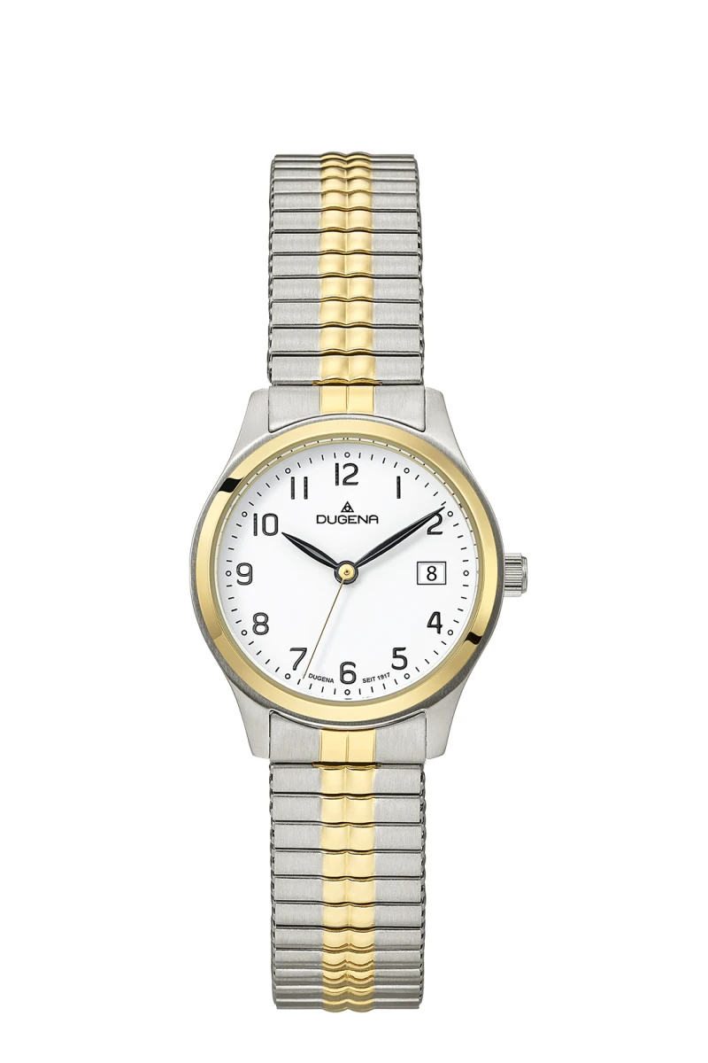 Dámské hodinky z chirurgické oceli s pružným náramkem. Díky pružnému náramku a přehlednému bílému ciferníku s černým číselníkem se jedná o velmi oblíbený typ dámských náramkových hodinek. Hodinky jsou vybavené datumkou, hodinovou, minutovou a vteřinovou ručkou. Hodinky mají odolné minerální sklíčko a jsou voděodolné na úrovni 5 ATM. Průměr pouzdra 28 mm. Zlaté části hodinek jsou pozlacené technologií IP žlutým zlatem.Chod těchto dámských hodinek zajišťuje spolehlivý bateriový strojek. Všechny dámské hodinky Dugena jsou dodávané v originální krabičce.