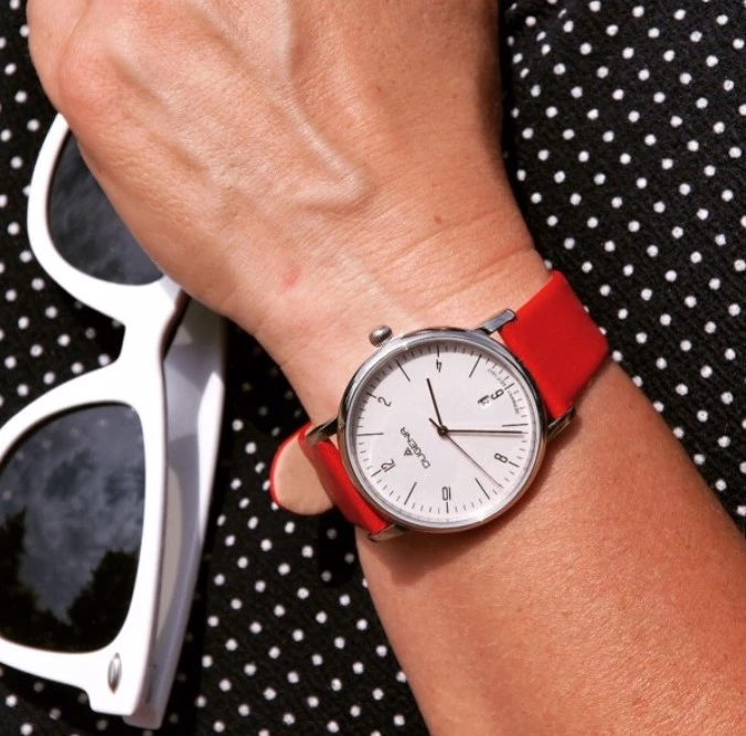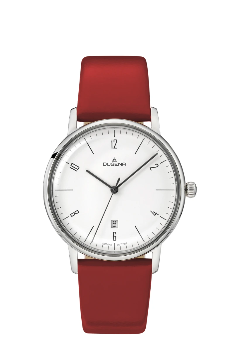 Moderní dámské hodinky Dugena s koženým řemínkem. Hodinky jsou vyrobené z chirurgické oceli, sklíčko hodinek je minerální. Ciferník je bílý s černými arabskými číslicemi a indexy. Hodinky jsou vybavené ukazatelem data, hodinovou, minutovou a vteřinovou ručkou. Rozměr pouzdra 38,5x9mm. Chod hodinek zajišťuje spolehlivý bateriový strojek. Hodinky jsou vodotěsné na úrovni 3 ATM. Na všechny dámské hodinky Dugena platí záruka v délce 36 měsíců. Hodinky jsou dodávané v dárkové krabičce s logem.