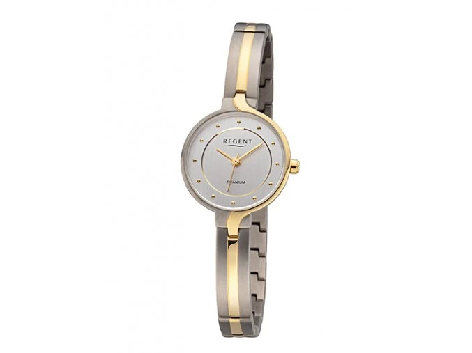 Dámské hodinky od Německého výrobce Regent. Hodinky jsou vyrobené z titanu. Hodinky jsou vybavené hodinovou, minutovou a vteřinovou ručkou, které zobrazují čas na stříbrném ciferníku se zlatými indexy. Pouzdro hodinek má průměr 25mm, výška pouzdra 6mm. Náramek se zapínáním na jednoduchou sponu je široký 8mm. Provoz hodinek zajišťuje spolehlivý bateriový strojek Hodinky jsou dodávané v originální krabičce s logem Regent. Díky použitému matriálu jsou hodinky velmi lehké. Povrch zlacených prvků je pozlacený technologií PVD. Tyto dámské hodinky jsou voděodolné na úrovni 3 ATM.