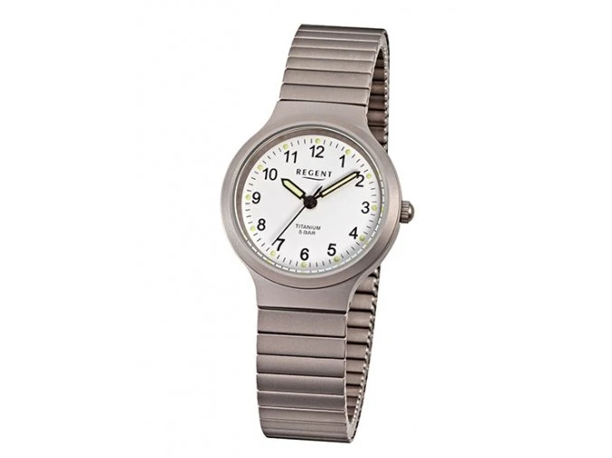 Dámské hodinky od Německého výrobce Regent. Hodinky jsou vyrobené z titanu. Hodinky jsou vybavené hodinovou, minutovou a vteřinovou ručkou, které zobrazují čas na bílém ciferníku s černým číselníkem. Luminiscenční hodinová, minutová ručka a indexy. Pouzdro hodinek má průměr 28mm, výška pouzdra 7mm. Pružný náramek široký 14mm je zárukou pohodlného nasazování a sundávání hodinek. Provoz hodinek zajišťuje spolehlivý bateriový strojek Hodinky jsou dodávané v originální krabičce s logem Regent. Díky použitému materiálu jsou hodinky velmi lehké. Tyto dámské hodinky jsou voděodolné na úrovni 5 ATM.