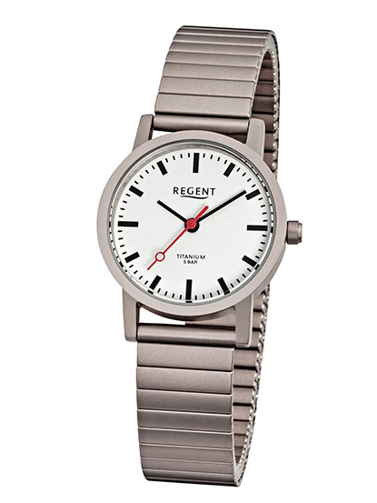 Dámské hodinky od Německého výrobce Regent. Hodinky jsou vyrobené z titanu. Hodinky jsou vybavené hodinovou, minutovou a červenou vteřinovou ručkou, které zobrazují čas na bílém ciferníku s indexy. Pouzdro hodinek má průměr 28mm, výška pouzdra 7mm. Pružný náramek široký 14mm je zárukou pohodlného nasazování a sundávání hodinek. Provoz hodinek zajišťuje spolehlivý bateriový strojek Hodinky jsou dodávané v originální krabičce s logem Regent. Díky použitému materiálu jsou hodinky velmi lehké. Tyto dámské hodinky jsou voděodolné na úrovni 5 ATM.