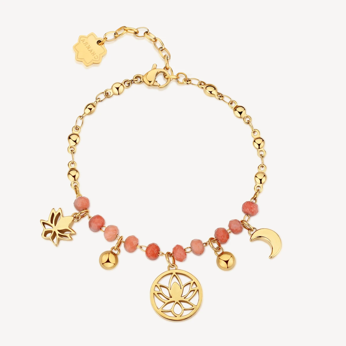 Dámský náramek z chirurgické oceli 316L s ozdobami lotosových květů. Povrch náramku je pozlacený technologií PVD. Náramek je osazený korálky z přírodního minerálu Chalcedon. Délka náramku 18cm.