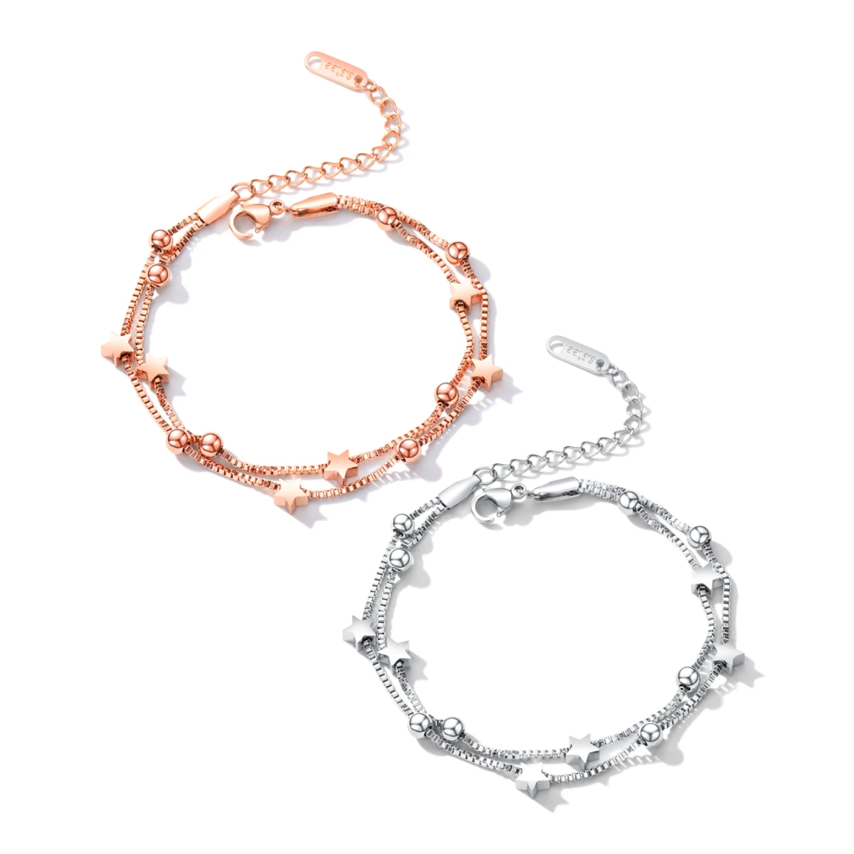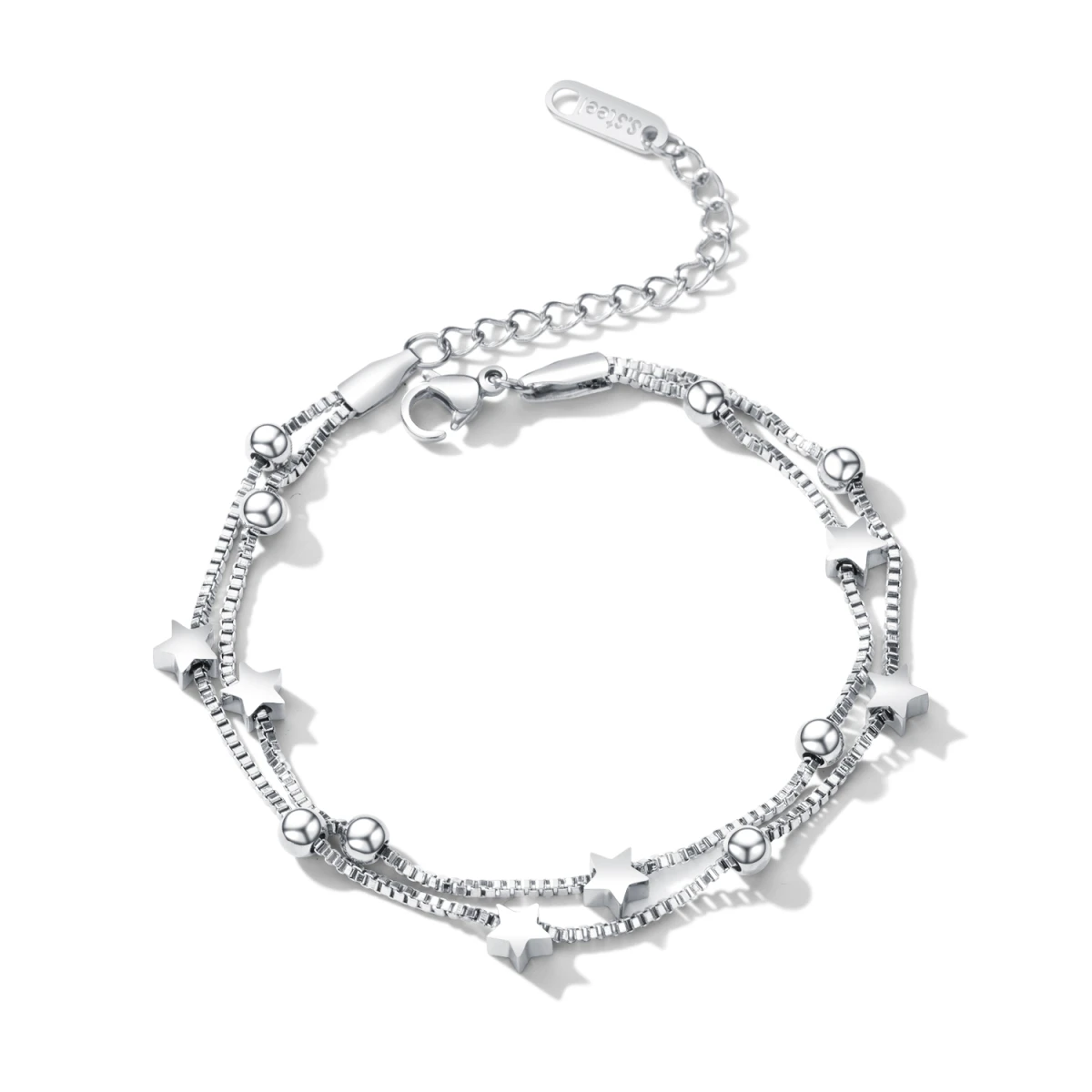 Dámský dvouřadý náramek na ruku z chirurgické oceli. Náramek tvoří dva hranaté řetízky 1x1mm s ozdobami hvězdiček 5x5mm a korálky s průměrem 4mm. Povrch náramku je leštěný. Zapínání náramku je na karabinu. Délku náramku lze nastavit v rozmezí 17,5cm - 20,5cm.