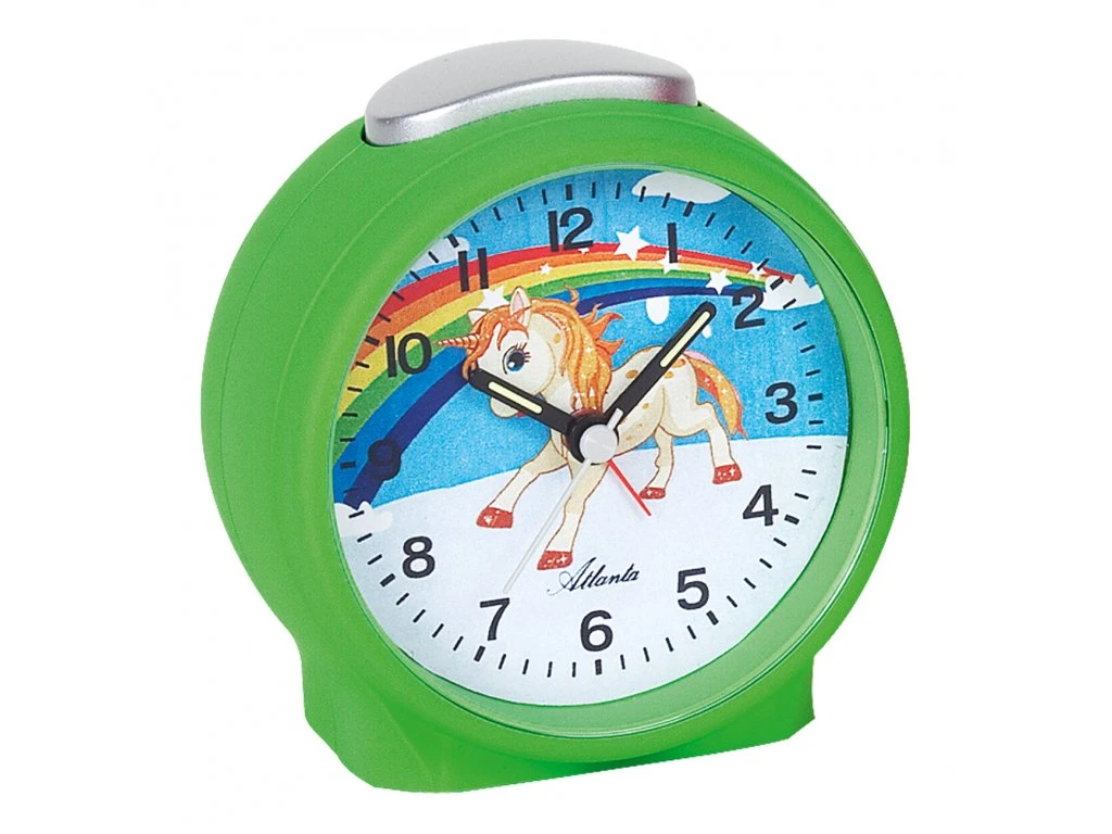 Dětský budík s jednorožcem. Budík má hodinovou, minutovou a vteřinovou ručku. Stlačením stříbrného tlačítka na vršku budíku dojde k osvětlení ciferníku. Budík má funkci alarmu s rostoucí intenzitou. Spuštěný alarm pípá. Průměr ciferníku 80 mm. Výška budíku 100 mm, šířka 95 mm, hloubka 60 mm. Pohon budíku je bateriový na 1 baterii typu AA. Baterie je součástí balení.
