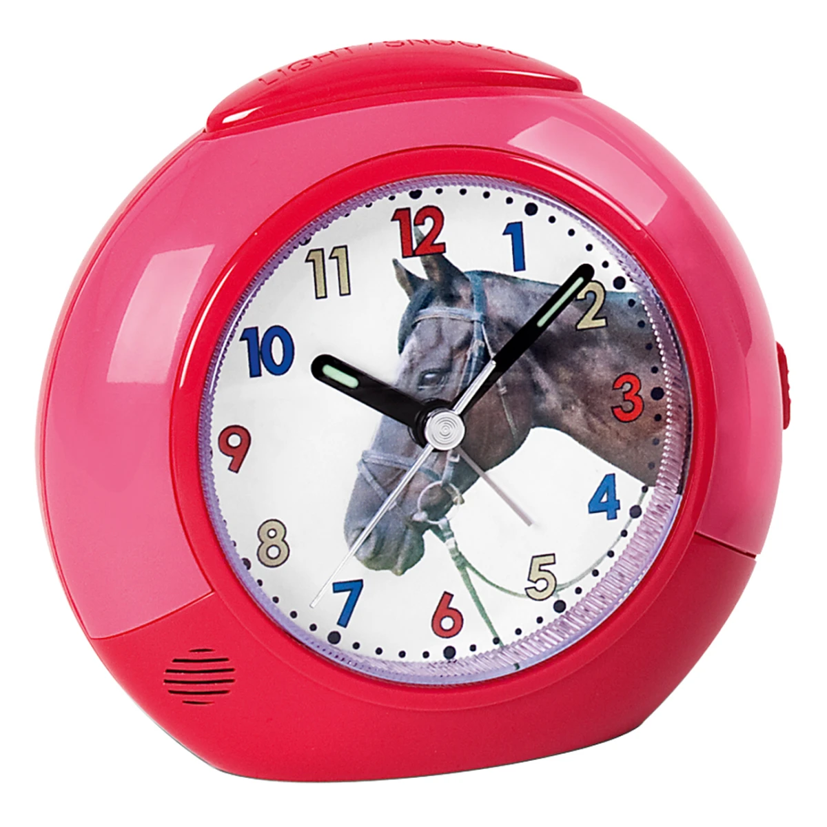 Dětský budík pro malé milovníky koní. Budík má hodinovou, minutovou a vteřinovou ručku. Stlačením tlačítka na vršku budíku dojde k osvětlení ciferníku. Budík má funkci alarmu. Spuštěný alarm pípá. Průměr ciferníku 72 mm. Výška budíku 100 mm, šířka 110 mm, hloubka 53 mm. Pohon budíku je bateriový na 1 baterii typu AA. Baterie je součástí balení.
