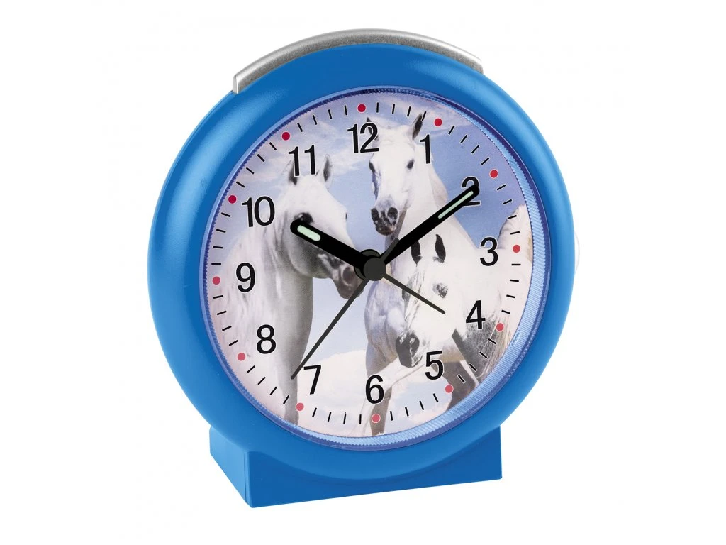 Dětský budík pro malé milovníky koní. Budík má hodinovou, minutovou a vteřinovou ručku. Stlačením stříbrného tlačítka na vršku budíku dojde k osvětlení ciferníku. Budík má funkci alarmu. Spuštěný alarm pípá. Průměr ciferníku 85 mm. Výška budíku 112 mm, šířka 105 mm, hloubka 44 mm. Pohon budíku je bateriový na 1 baterii typu AA. Baterie je součástí balení.