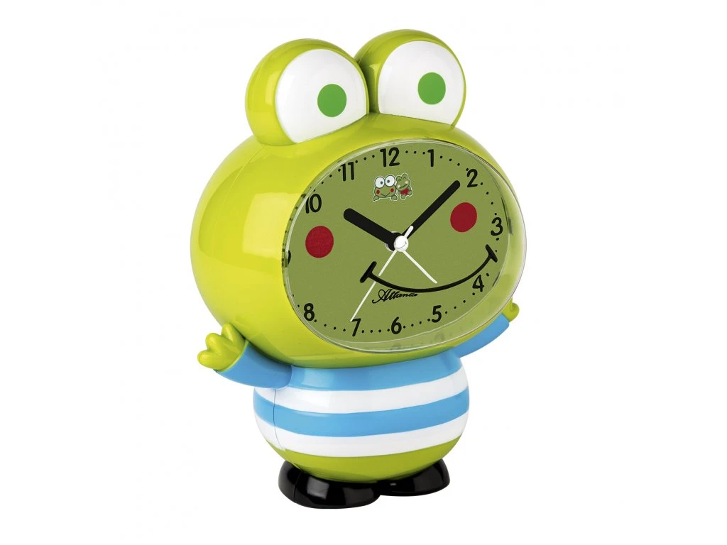 Velký dětský budík "Žába". Budík má hodinovou, minutovou a vteřinovou ručku. Po stisknutí sklíčka ciferníku se rozsvítí osvětlení. Budík má funkci alarmu s možností volby melodie, nebo tónu. Alarm se aktivuje-deaktivuje stlačením stříbrného tlačítka schovaného za žabákovýma očima. Oválný ciferník je v nejširším bodě široký 100mm. Výška budíku 170 mm, šířka 140 mm, hloubka 105 mm. Pohon budíku je bateriový na 2 baterie typu AA. Baterie jsou součástí balení.