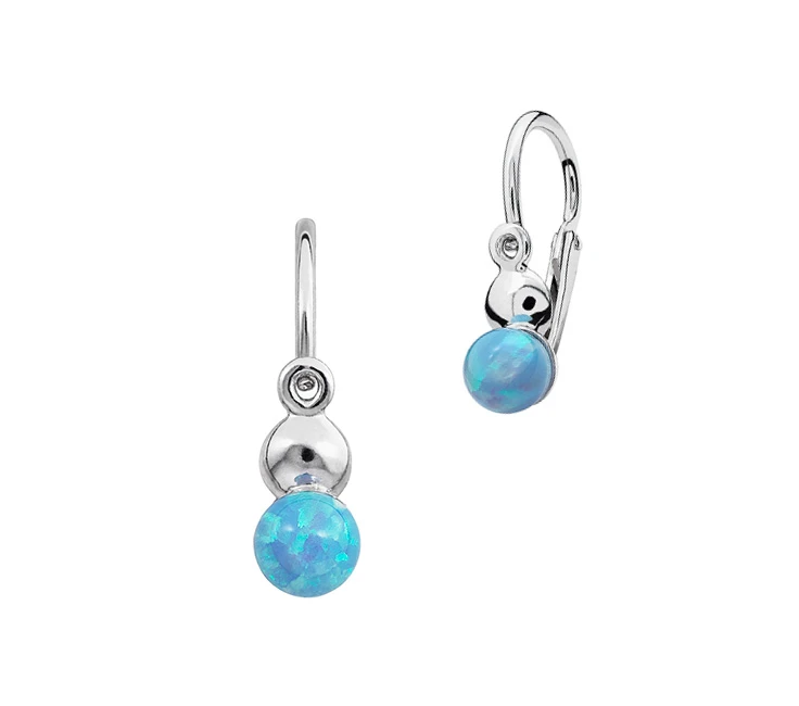 Dětské náušnice ze zlata ryzosti 585/000 ozdobené kulatým modrým opálem s průměrem 4mm. Zlaté dětské náušnice s náušnicovým zapínáním na dětskou brizuru. Náušnicové zapínání na brizuru je zkonstruované tak, aby jeho otevření malou princeznou bylo téměř nemožné. Velikost náušniček 16x4mm.
