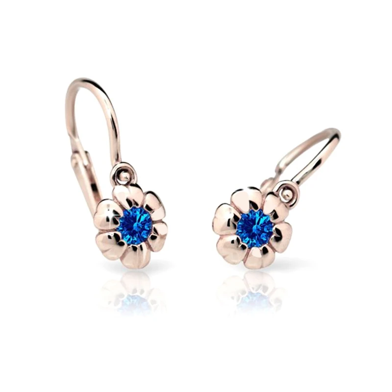 Dětské náušnice z růžového zlata ryzosti 585/000. Povrch náušnic je leštěný. Náušnice s ozdobou květu. Ve středu květu je kamínek. Rozměry náušniček najdete zobrazené na podpůrné fotografii. Náušnice mají bezpečnostní zapínání na dětskou brizuru. Krásné zlaté dětské náušnice od českého výrobce CUTIE JEWELLERY