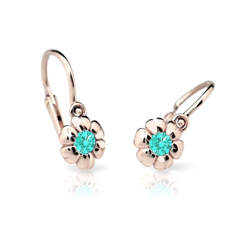 Dětské náušnice z růžového zlata ryzosti 585/000. Povrch náušnic je leštěný. Náušnice s ozdobou květu. Ve středu květu je kamínek. Rozměry náušniček najdete zobrazené na podpůrné fotografii. Náušnice mají bezpečnostní zapínání na dětskou brizuru. Krásné zlaté dětské náušnice od českého výrobce CUTIE JEWELLERY