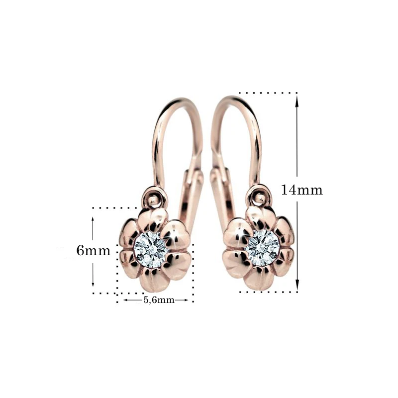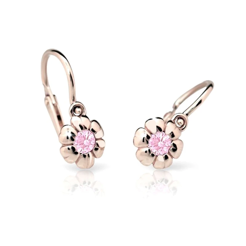 Dětské náušnice z růžového zlata ryzosti 585/000. Povrch náušnic je leštěný. Náušnice s ozdobou květu. Ve středu květu je kamínek. Rozměry náušniček najdete zobrazené na podpůrné fotografii. Náušnice mají bezpečnostní zapínání na dětskou brizuru. Krásné zlaté dětské náušnice od českého výrobce CUTIE JEWELLERY