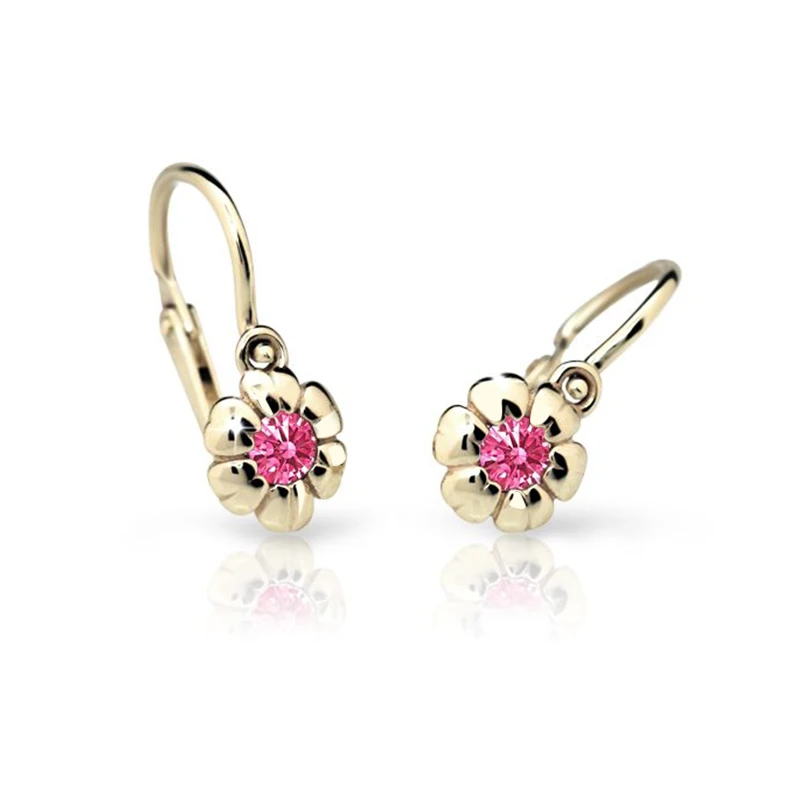 Dětské náušnice ze žlutého zlata ryzosti 585/000. Povrch náušnic je leštěný. Náušnice s ozdobou květu. Ve středu květu je kamínek. Rozměry náušniček najdete zobrazené na podpůrné fotografii. Náušnice mají bezpečnostní zapínání na dětskou brizuru. Krásné zlaté dětské náušnice od českého výrobce CUTIE JEWELLERY. Uvedená cena za 1 pár.