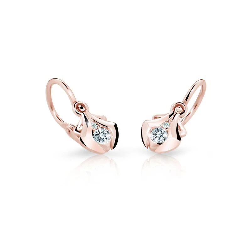 Dětské náušnice z růžového zlata 585/1000. Náušničky mají zapínání na dětskou brizuru. Toto zapínání, je zkonstruované právě pro dětské náušnice, zamezuje jeho nechtěnému rozevření a následné ztrátě náušničky. Rozměry náušniček 13mm x 5,8mm x 5,7mm najdete zobrazené na podpůrné fotografii. Náušničky jsou ozdobené zářivými zirkony.