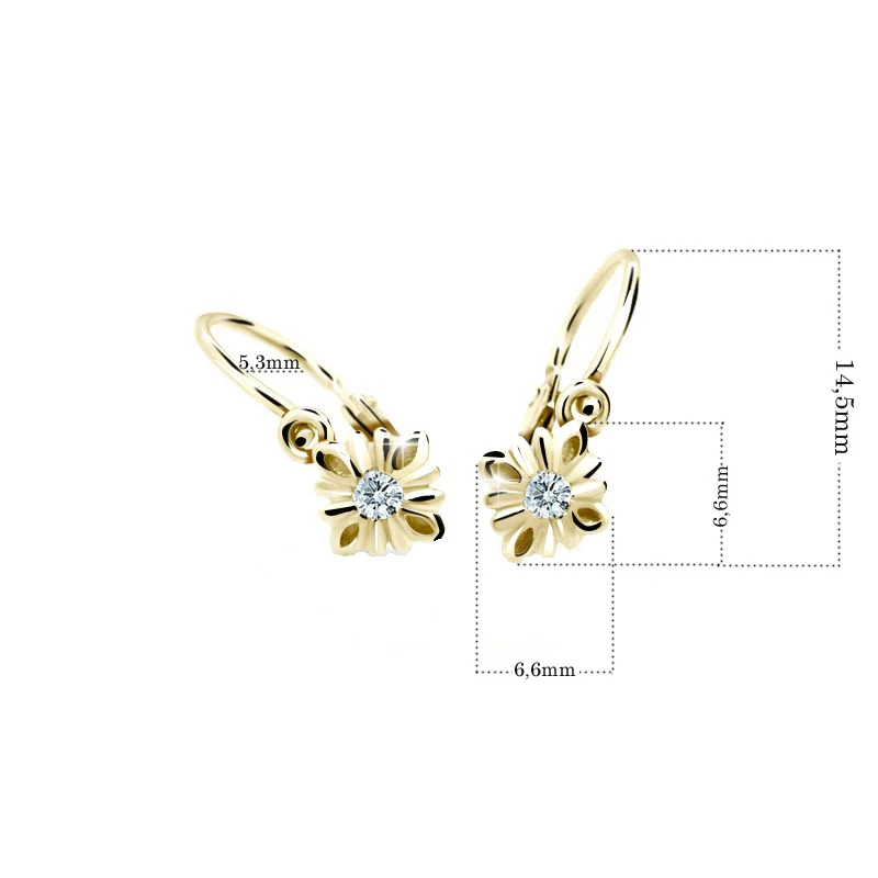 Dětské náušnice ze žlutého zlata 585/1000. Náušničky mají zapínání na dětskou brizuru. Toto zapínání, je zkonstruované právě pro dětské náušnice, zamezuje jeho nechtěnému rozevření a následné ztrátě náušničky. Rozměry náušniček 14,5mm x 6,6mm x 6,6mm najdete zobrazené na podpůrné fotografii. Náušničky jsou ozdobené zářivými zirkony.