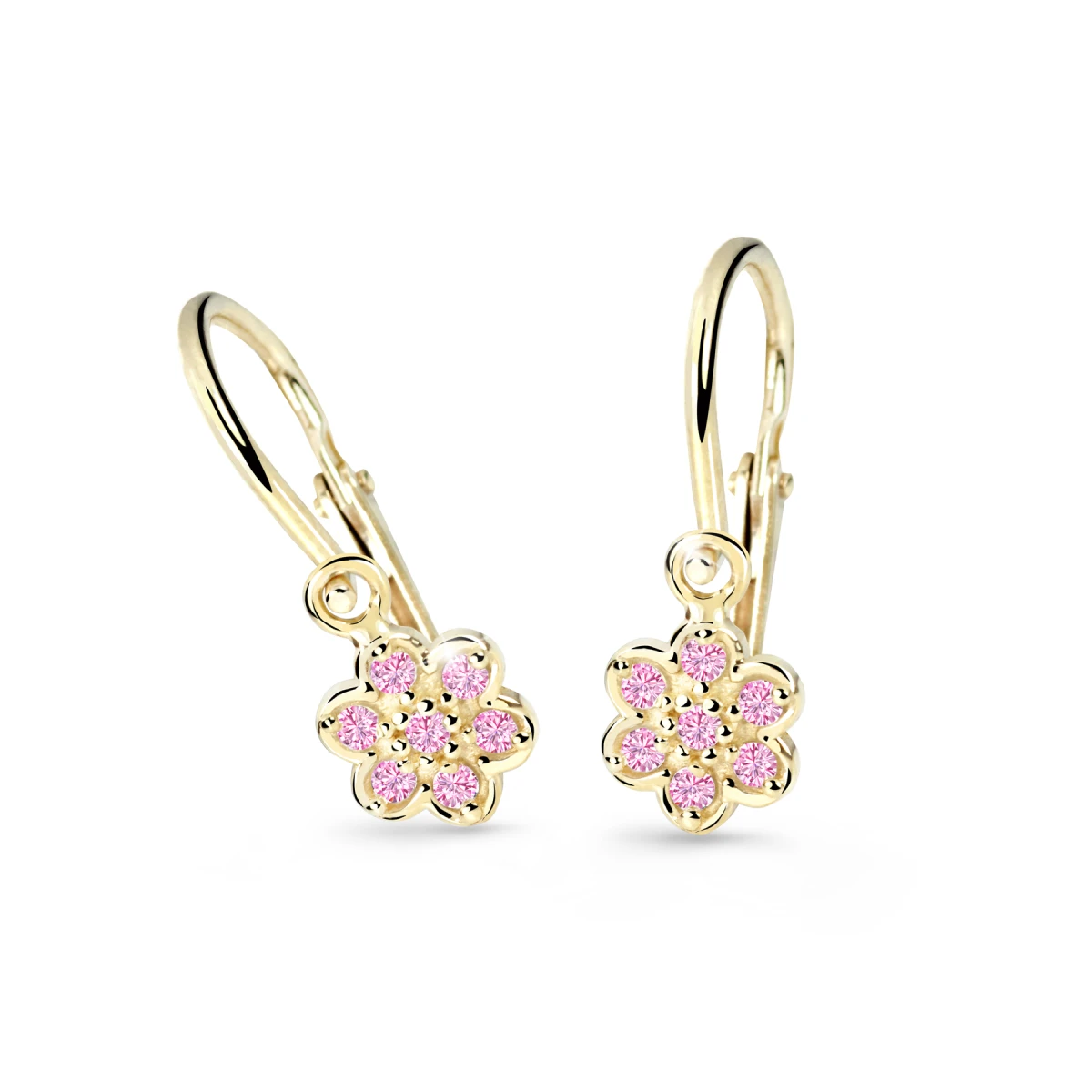 Zlaté dětské náušnice ze žlutého zlata ryzosti 585/000. Dětské náušničky ozdobené zářivými kamínky. Náušnice pro miminko se zapínáním na bezpečností dětskou brizuru. Průměr ozdobné části náušnic 5 mm, celková výška náušniček 13 mm.