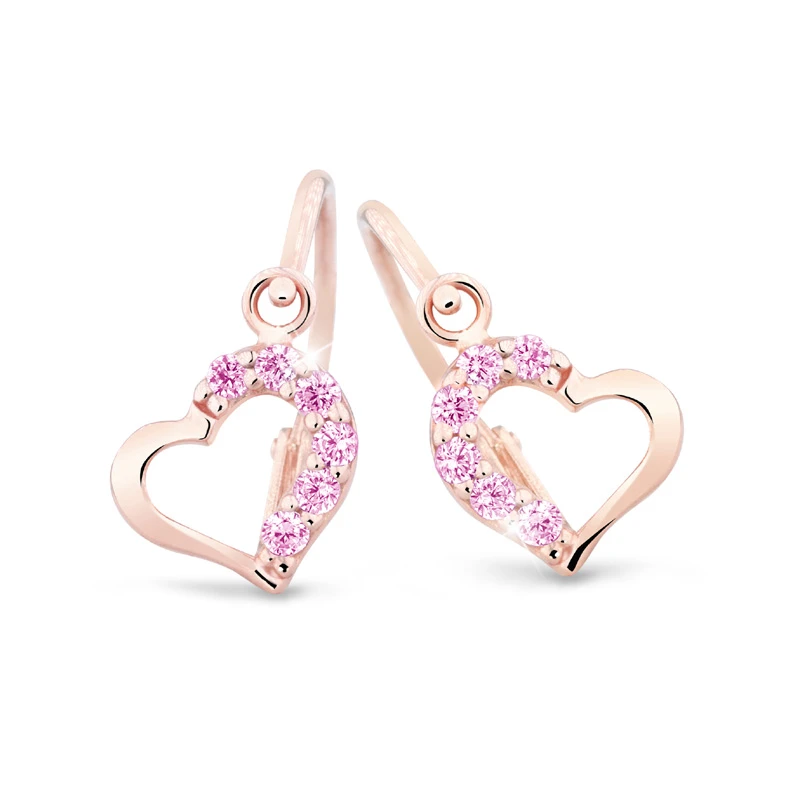 Dětské náušnice z růžového zlata 585/1000. Náušničky mají zapínání na dětskou brizuru. Toto zapínání je zkonstruované právě pro dětské náušnice a zamezuje jeho nechtěnému rozevření a následné ztrátě náušničky. Rozměry náušniček 14mm x 7mm x 7mm najdete zobrazené na podpůrné fotografii. Náušničky jsou ozdobené zářivými zirkony.