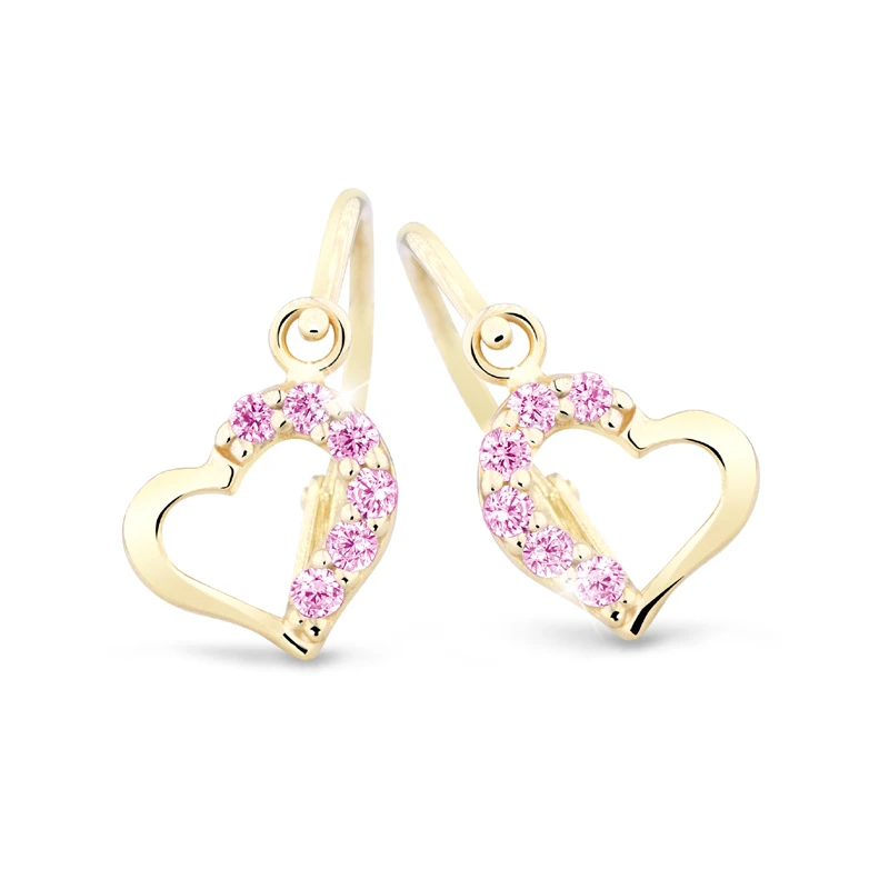 Dětské náušnice ze žlutého zlata 585/1000. Náušničky mají zapínání na dětskou brizuru. Toto zapínání je zkonstruované právě pro dětské náušnice a zamezuje jeho nechtěnému rozevření a následné ztrátě náušničky. Rozměry náušniček 14mm x 7mm x 7mm najdete zobrazené na podpůrné fotografii. Náušničky jsou ozdobené zářivými zirkony.