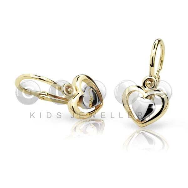 Dětské visací náušnice ze žlutého zlata ryzosti 585/000. Povrch náušnic je leštěný. Náušnice s ozdobou srdíčka. Průměr náušnic: 14mm, rozměr ozdoby 7,5*1,5mm. Náušnice mají bezpečnostní dětské zapínání. Krásné dětské náušnice od českého výrobce CUTIE JEWELLERY. Uvedená cena za 1 pár.
