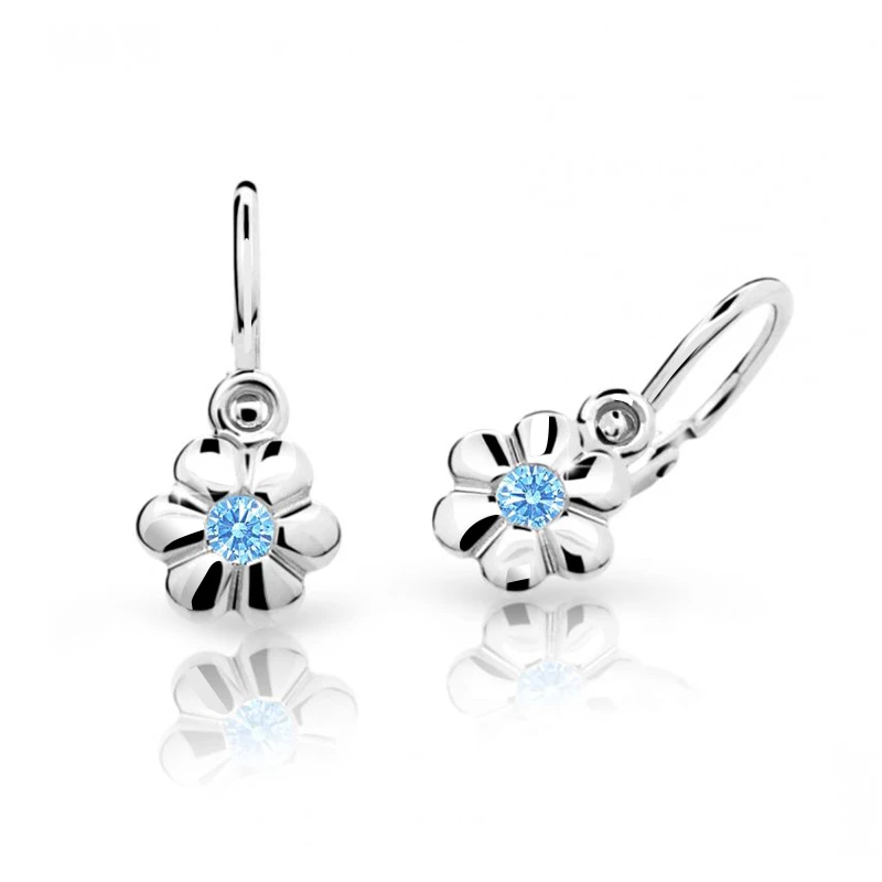 Dětské náušnice z bílého zlata 585/000. Náušnice jsou ozdobené kamínkem. Velikost náušnic 13,8mm, rozměr ozdoby s kamínkem 5,5x5,8mm. Náušnice mají bezpečnostní dětské zapínání na brizuru, které zamezuje snadnému rozevření a ztrátě náušničky.