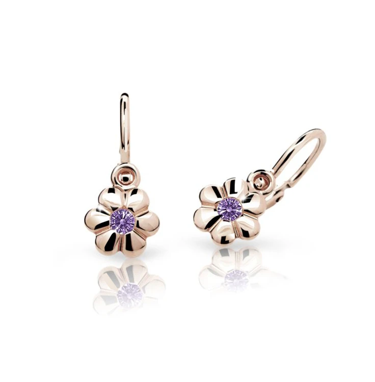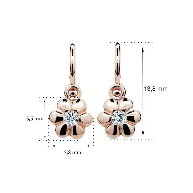 Dětské náušnice z růžového zlata 585/000. Náušnice jsou ozdobené kamínkem. Velikost náušnic 13,8mm, rozměr ozdoby s kamínkem 5,5x5,8mm. Náušnice mají bezpečnostní dětské zapínání na brizuru, které zamezuje snadnému rozevření a ztrátě náušničky.