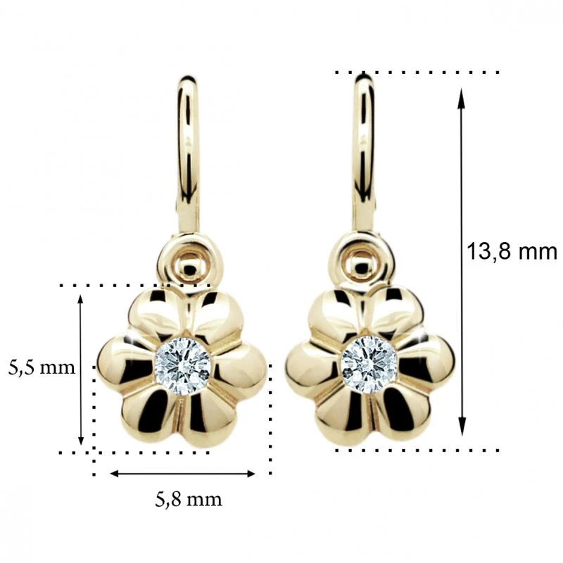 Dětské náušnice ze žlutého zlata ryzosti 585/000. Náušnice jsou ozdobené kamínkem. Velikost náušnic 13,8mm, rozměr ozdoby s kamínkem 5,5x5,8mm. Náušnice mají bezpečnostní dětské zapínání na brizuru, které zamezuje snadnému rozevření a ztrátě náušničky.