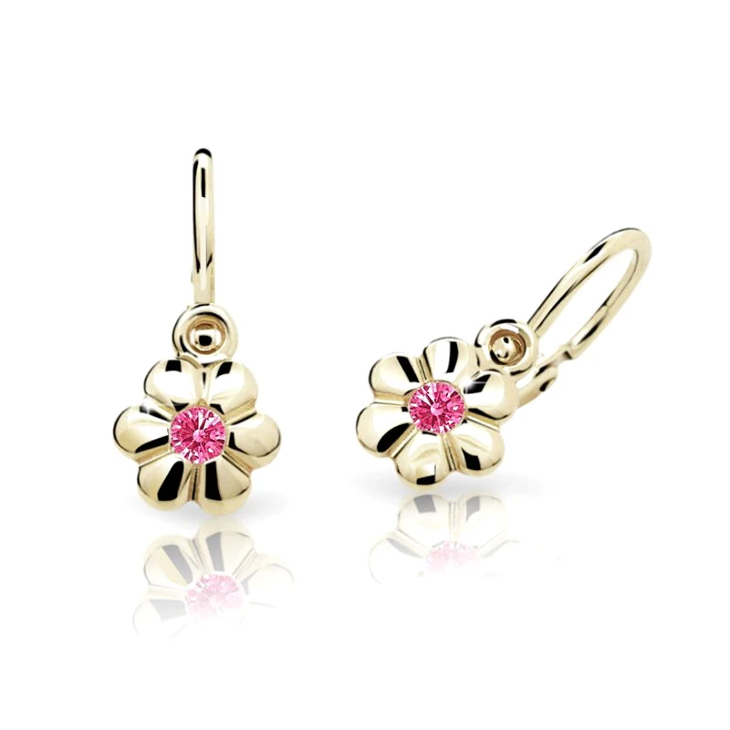 Dětské náušnice ze žlutého zlata ryzosti 585/000. Povrch náušnic je leštěný. Náušnice jsou ozdobené kamínkem. Velikost náušnic 13,8mm, rozměr ozdoby s kamínkem 5,5x5,8mm. Náušnice mají bezpečnostní dětské zapínání na brizuru, které zamezuje snadnému rozevření a ztrátě náušničky.