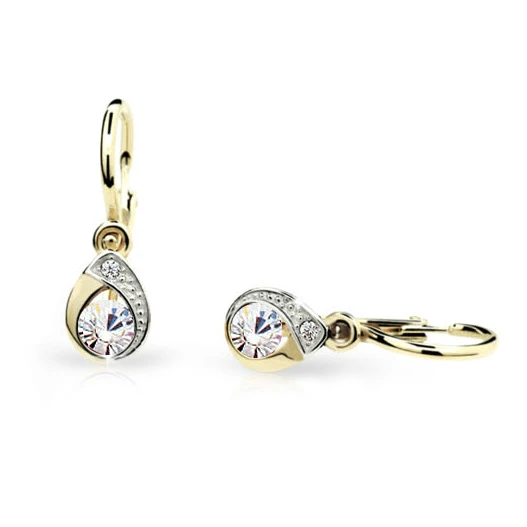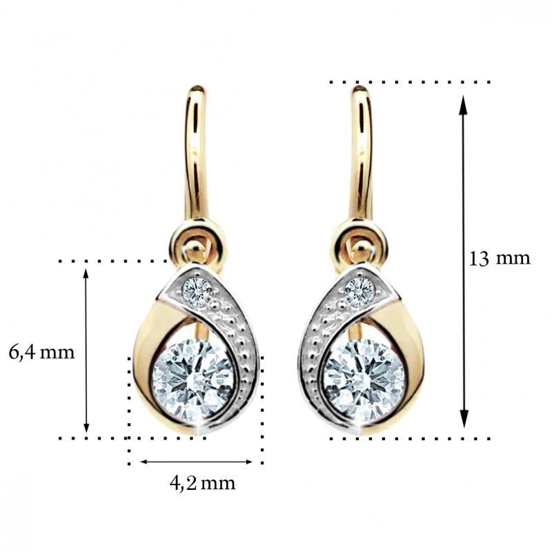 Dětské náušnice ze žlutého zlata 585/1000. Náušničky mají zapínání na dětskou brizuru. Toto zapínání je zkonstruované právě pro dětské náušnice a zamezuje jeho nechtěnému rozevření a následné ztrátě náušničky. Rozměry náušniček 13mm x 6,4mm x 4,2mm najdete zobrazené na podpůrné fotografii. Náušničky jsou ozdobené zářivými zirkony.