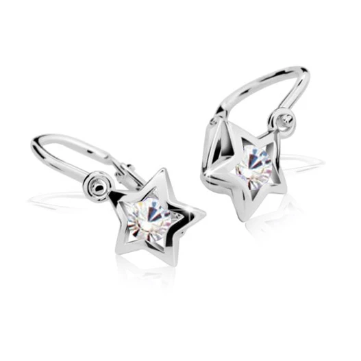 Dětské visící náušnice z bílého zlata ryzosti 585/000. Povrch náušnic je leštěný. Náušnice je zdobená hvězdičkou s kamínkem. Průměr náušnic: 14mm, rozměr ozdoby 7 * 2mm. Náušnice mají bezpečnostní dětské zapínání. Krásné dětské náušnice od českého výrobce CUTIE JEWELLERY. Uvedená cena za 1 pár.