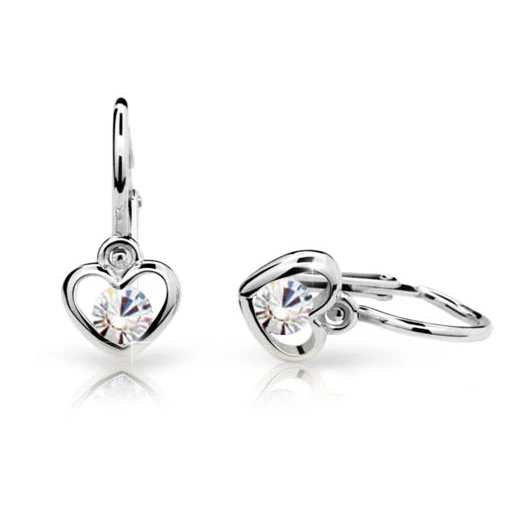 Dětské visací náušnice z bílého zlata ryzosti 585/000. Povrch náušnic je leštěný. Náušnice je zdobená srdíčkem s kamínkem. Průměr náušnic: 14mm, rozměr ozdoby 6*6mm. Náušnice mají bezpečnostní dětské zapínání. Krásné dětské náušnice od českého výrobce CUTIE JEWELLERY. Uvedená cena za 1 pár.